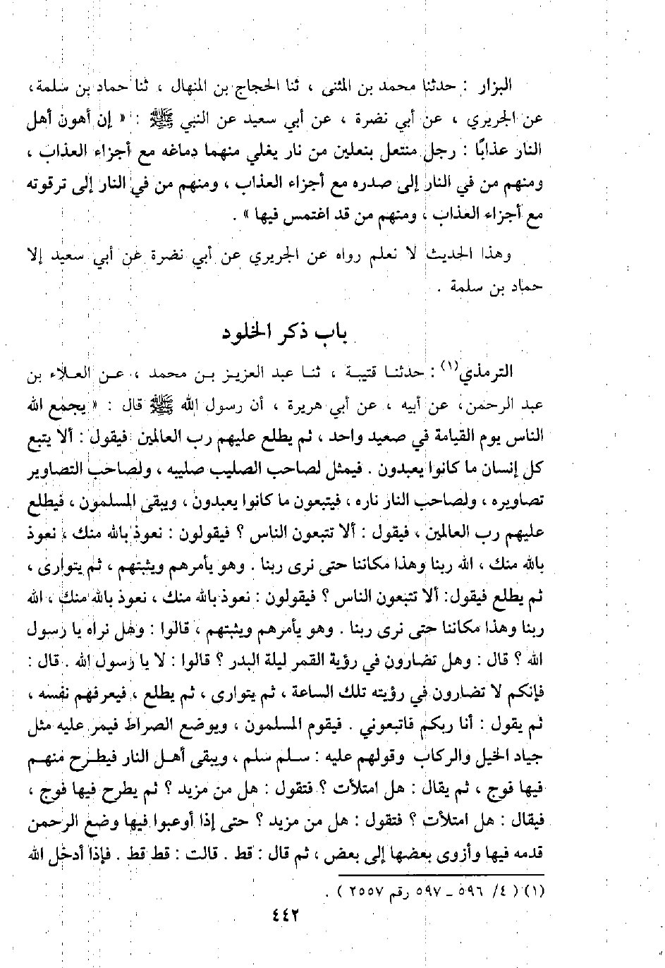 التِّرْمِذِيّ: حَدثنَا قُتَيْبَة، ثَنَا عبد الْعَزِيز بن مُحَمَّد، عَن الْعَلَاء، بن عبد الرَّحْمَن، عَن أَبِيه، عَن أبي هُرَيْرَة، أَن رَسُول الله - صَلَّى اللَّهُ عَلَيْهِ وَسَلَّم َ - قَالَ: " يجمع الله النَّاس يَوْم الْقِيَامَة فِي صَعِيد وَاحِد، ثمَّ يطلع عَلَيْهِم رب الْعَالمين فَيَقُول: أَلا يتبع كل إِنْسَان مَا كَانُوا يعْبدُونَ. فيمثل لصَاحب الصَّلِيب صليبه، وَلِصَاحِب التصاوير تصاويره، وَلِصَاحِب النَّار ناره، فيتبعون مَا كَانُوا يعْبدُونَ، وَيبقى الْمُسلمُونَ، فَيطلع عَلَيْهِم رب الْعَالمين، فَيَقُول: أَلا تتبعون النَّاس؟ فَيَقُولُونَ: نَعُوذ بِاللَّه مِنْك، نَعُوذ بِاللَّه مِنْك، الله رَبنَا وَهَذَا مَكَاننَا حَتَّى نرى رَبنَا. وَهُوَ يَأْمُرهُم ويثبتهم، ثمَّ يتَوَارَى، ثمَّ يطلع فَيَقُول: أَلا تتبعون النَّاس؟ فَيَقُولُونَ: نَعُوذ بِاللَّه مِنْك، نَعُوذ بِاللَّه مِنْك، الله رَبنَا وَهَذَا مَكَاننَا حَتَّى نرى رَبنَا. وَهُوَ يَأْمُرهُم ويثبتهم، قَالُوا: وَهل نرَاهُ يَا رَسُول الله؟ قَالَ: وَهل تضَارونَ فِي رُؤْيَة الْقَمَر لَيْلَة الْبَدْر؟ قَالُوا: لَا يَا رَسُول الله. قَالَ: فَإِنَّكُم لَا تضَارونَ فِي رُؤْيَته تِلْكَ السَّاعَة ثمَّ يتَوَارَى، ثمَّ يطلع، فيعرفهم نَفسه، ثمَّ يَقُول: أَنا ربكُم فَاتبعُوني. فَيَقُول الْمُسلمُونَ، وَيُوضَع الصِّرَاط فيمر عَلَيْهِ مثل جِيَاد الْخَيل والركاب وَقَوْلهمْ عَلَيْهِ: سلم سلم، وَيبقى أهل النَّار فيطرح مِنْهُم فِيهَا فَوْج، ثمَّ يُقَال: هَل امْتَلَأت؟ فَتَقول: هَل من مزِيد؟ ثمَّ يطْرَح فِيهَا فَوْج،
