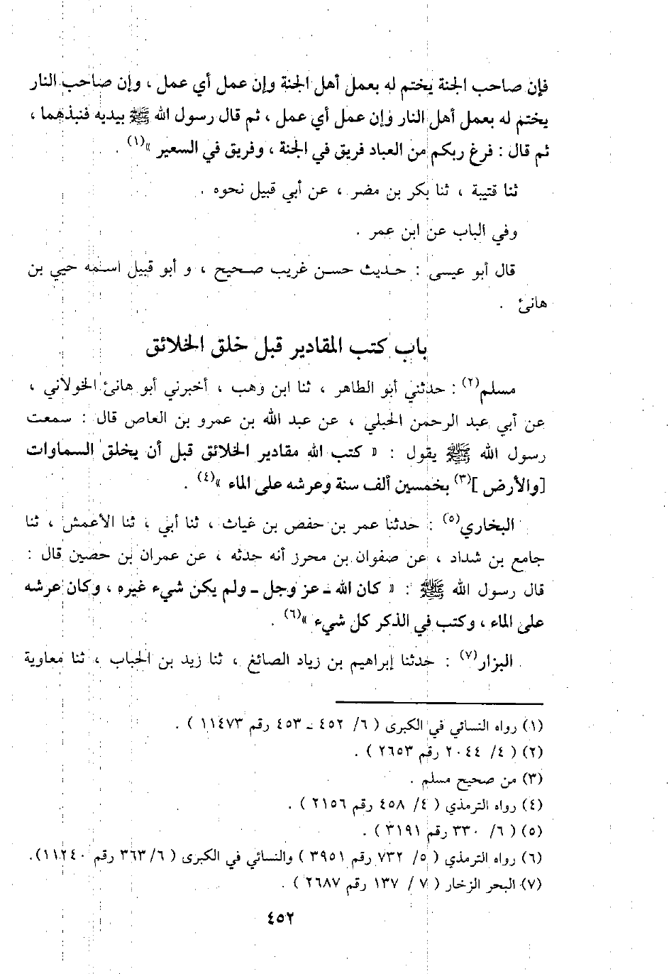 مُسلم: حَدثنِي أَبُو الطَّاهِر، ثَنَا ابْن وهب، أَخْبرنِي أَبُو هَانِئ الْخَولَانِيّ، عَن أبي عبد الرَّحْمَن الحبلي، عَن عبد الله بن عَمْرو بن الْعَاصِ قَالَ: سَمِعت رَسُول الله - صَلَّى اللَّهُ عَلَيْهِ وَسَلَّم َ - يَقُول: " كتب الله مقادير الْخَلَائق قبل أَن يخلق السَّمَاوَات [وَالْأَرْض] بِخَمْسِينَ ألف سنة وعرشه على المَاء ".