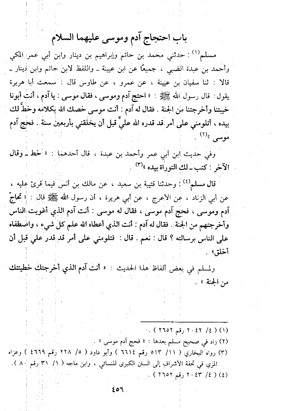 مُسلم: حَدثنِي مُحَمَّد بن حَاتِم وَإِبْرَاهِيم بن دِينَار وَابْن أبي عمر الْمَكِّيّ وَأحمد بن عَبدة الضَّبِّيّ، جَمِيعًا عَن ابْن عُيَيْنَة - وَاللَّفْظ لِابْنِ حَاتِم وَابْن دِينَار - قَالَا: ثَنَا سُفْيَان بن عُيَيْنَة، عَن عَمْرو، عَن طَاوس قَالَ: سَمِعت أَبَا هُرَيْرَة يَقُول: قَالَ رَسُول الله - صَلَّى اللَّهُ عَلَيْهِ وَسَلَّم َ -: " احْتج آدم ومُوسَى، فَقَالَ مُوسَى: يَا آدم، أَنْت أَبونَا خيبتنا وأخرجتنا من الْجنَّة. فَقَالَ لَهُ آدم: أَنْت مُوسَى خصك الله بِكَلَامِهِ وَخط لَك بِيَدِهِ، أتلومني على أَمر قد قدره الله عَليّ قبل أَن يخلقني بِأَرْبَعِينَ سنة. فحج آدم مُوسَى ".