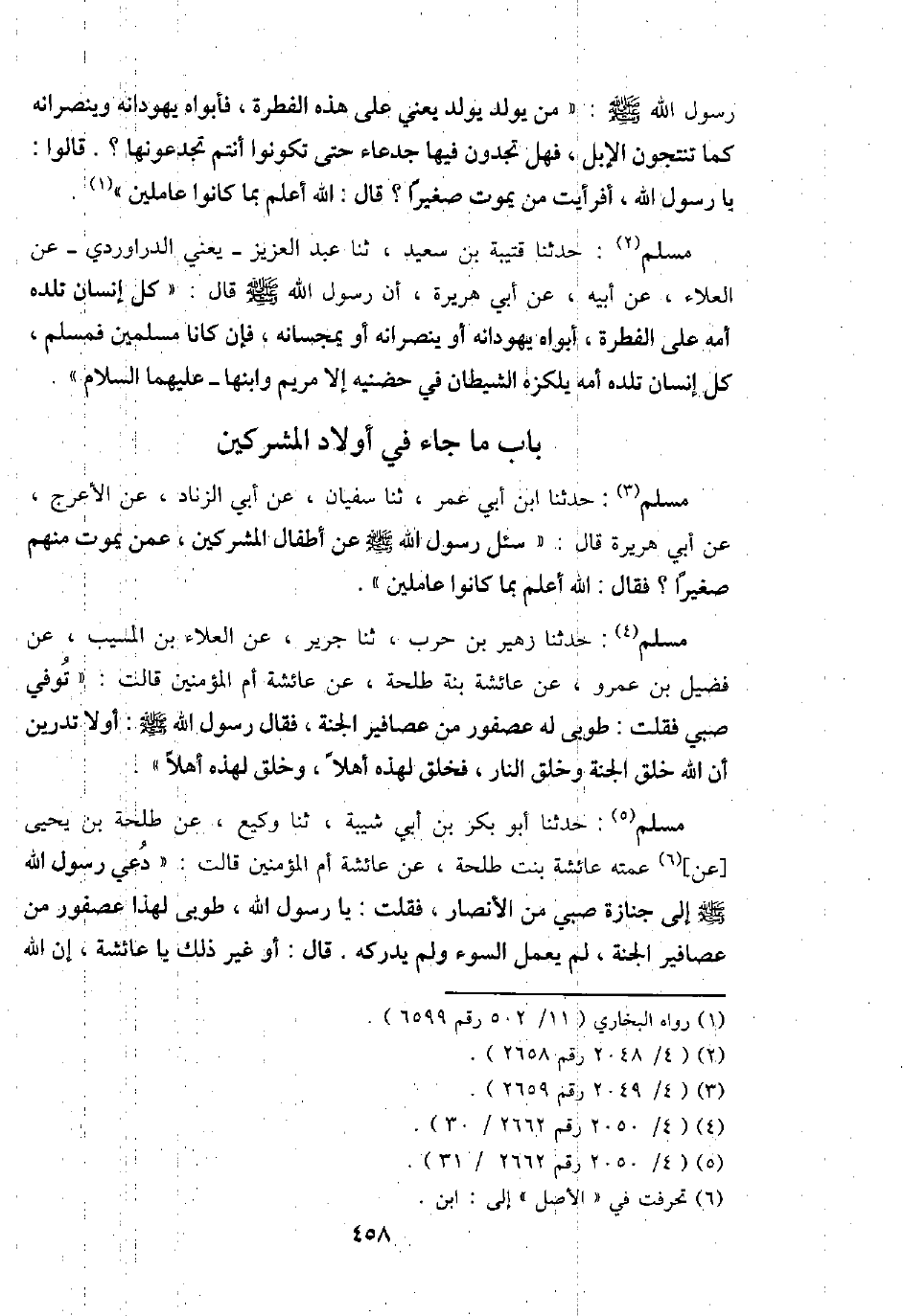 مُسلم: حَدثنَا ابْن أبي عمر، ثَنَا سُفْيَان، عَن أبي الزِّنَاد، عَن الْأَعْرَج، عَن أبي هُرَيْرَة قَالَ: " سُئِلَ رَسُول الله - صَلَّى اللَّهُ عَلَيْهِ وَسَلَّم َ - عَن أَطْفَال الْمُشْركين، عَمَّن يَمُوت مِنْهُم صَغِيرا؟ فَقَالَ: الله أعلم بِمَا كَانُوا عاملين ".