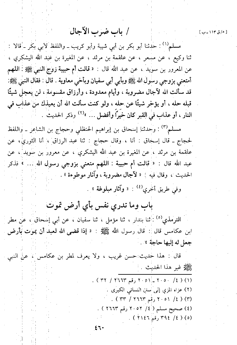 مُسلم: وَحدثنَا إِسْحَاق بن إِبْرَاهِيم الْحَنْظَلِي وحجاج بن الشَّاعِر - وَاللَّفْظ لحجاج - قَالَ إِسْحَاق: أَنا، وَقَالَ حجاج: ثَنَا عبد الرَّزَّاق، أَنا الثَّوْريّ، عَن عَلْقَمَة بن مرْثَد، عَن الْمُغيرَة بن عبد الله الْيَشْكُرِي، عَن معْرور بن سُوَيْد، عَن عبد الله قَالَ: " قَالَت أم حَبِيبَة: اللَّهُمَّ متعني بزوجي رَسُول الله ... . " فَذكر الحَدِيث، وَقَالَ فِيهِ: " لآجال مَضْرُوبَة، وآثار مَوْطُوءَة ".