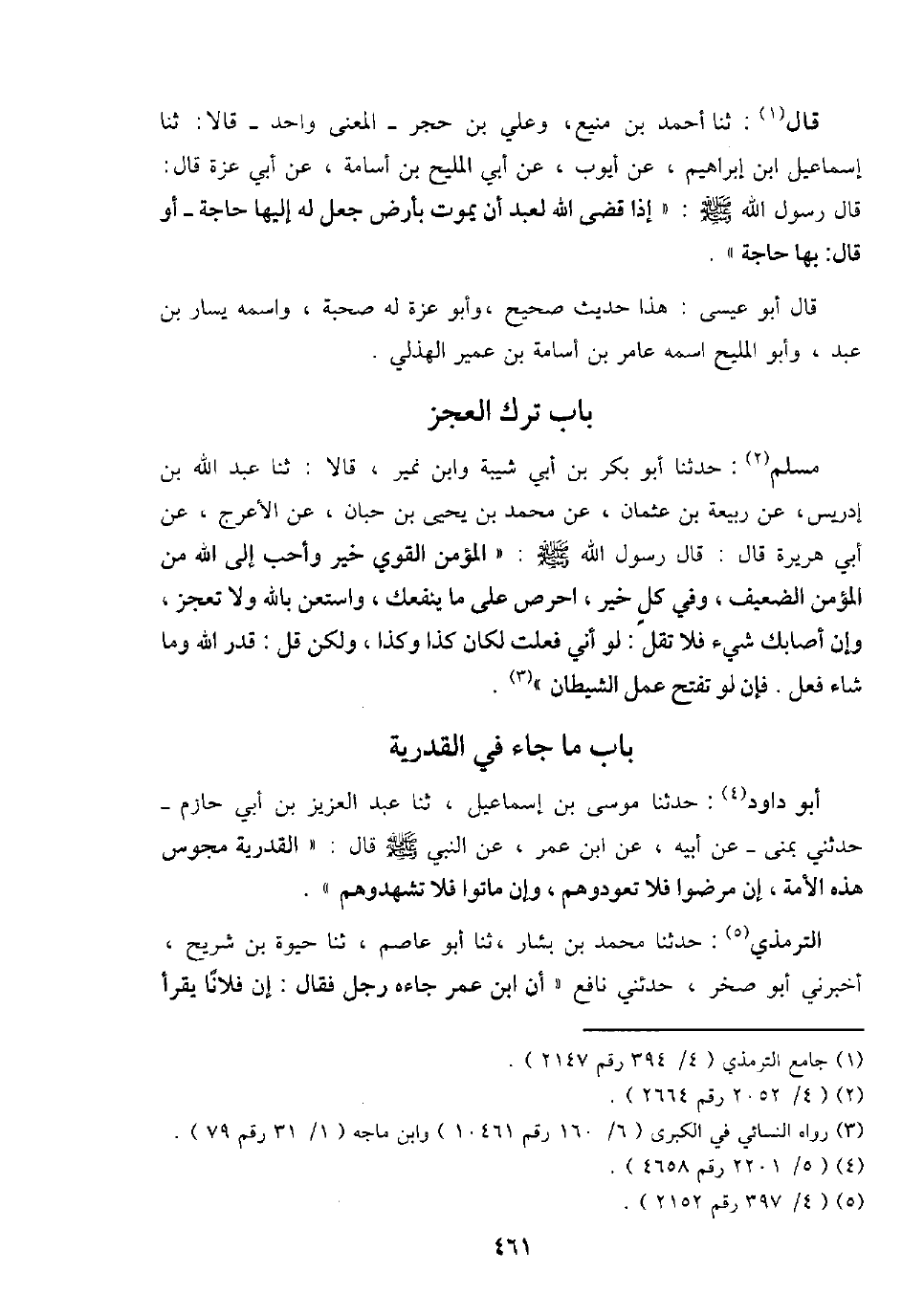 مُسلم: حَدثنَا أَبُو بكر بن أبي شيبَة وَابْن نمير، قَالَا: ثَنَا عبد الله بن إِدْرِيس، عَن ربيعَة بن عُثْمَان، عَن مُحَمَّد بن يحيى بن حبَان، عَن الْأَعْرَج، عَن أبي هُرَيْرَة قَالَ: قَالَ رَسُول الله - صَلَّى اللَّهُ عَلَيْهِ وَسَلَّم َ -: " الْمُؤمن الْقوي خير وَأحب إِلَى الله من الْمُؤمن الضَّعِيف، وَفِي كل خير، احرص على مَا ينفعك، واستعن بِاللَّه وَلَا تعجز، وَإِن أَصَابَك شَيْء فَلَا تقل: لَو أَنِّي فعلت لَكَانَ كَذَا وَكَذَا، وَلَكِن قل: قدر الله وَمَا شَاءَ فعل. فَإِن لَو تفتح عمل الشَّيْطَان ".