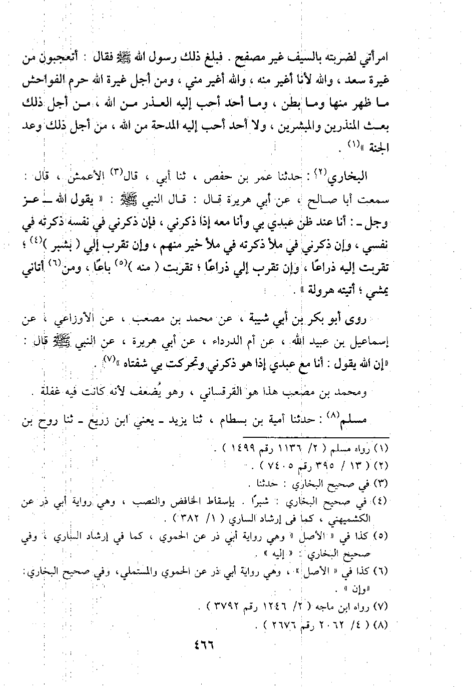 البُخَارِيّ: حَدثنَا عمر بن حَفْص، ثَنَا أبي، قَالَ الْأَعْمَش، قَالَ: سَمِعت أَبَا صَالح، عَن أبي هُرَيْرَة قَالَ: قَالَ النَّبِي - صَلَّى اللَّهُ عَلَيْهِ وَسَلَّم َ -: " يَقُول الله - عز وَجل -: أَنا عِنْد ظن عَبدِي بِي وَأَنا مَعَه إِذا ذَكرنِي، فَإِن ذَكرنِي فِي نَفسه ذكرته فِي نَفسِي، وَإِن ذَكرنِي فِي مَلأ ذكرته فِي مَلأ خير مِنْهُم، وَإِن تقرب إِلَيّ (بشبر) ؛ تقربت إِلَيْهِ ذِرَاعا، وَإِن تقرب إِلَيّ ذِرَاعا؛ تقربت (مِنْهُ) باعاً، وَمن أَتَانِي يمشي؛ أَتَيْته هرولة ".