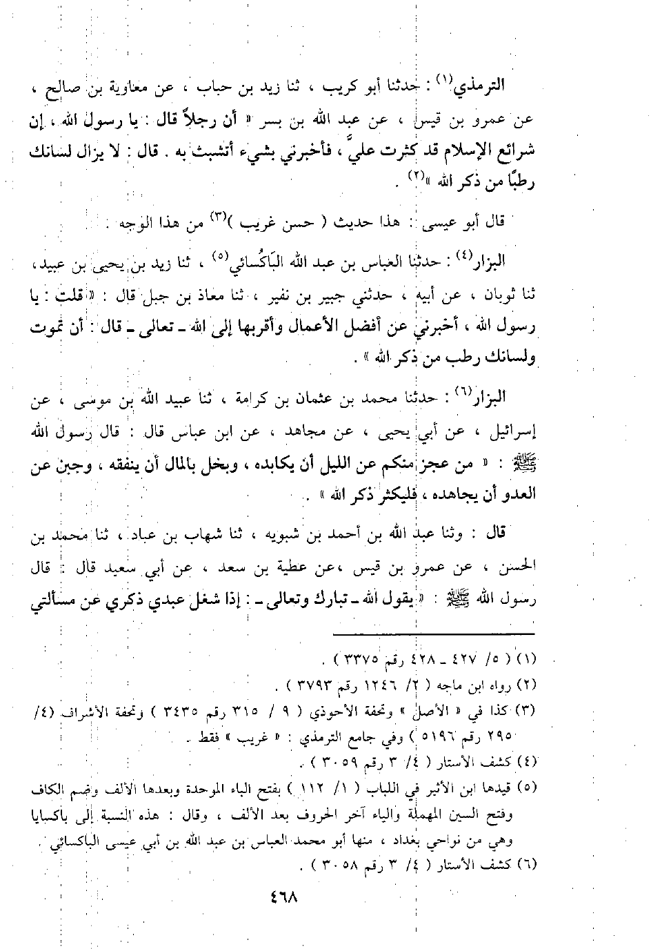 التِّرْمِذِيّ: حَدثنَا أَبُو كريب، ثَنَا زيد بن حباب، عَن مُعَاوِيَة بن صَالح، عَن عَمْرو بن قيس، عَن عبد الله بن بسر " أَن رجلا قَالَ: يَا رَسُول الله، إِن شرائع الْإِسْلَام قد كثرت عَليّ، فَأَخْبرنِي بِشَيْء أتشبث بِهِ. قَالَ: لَا يزَال لسَانك رطبا من ذكر الله ".