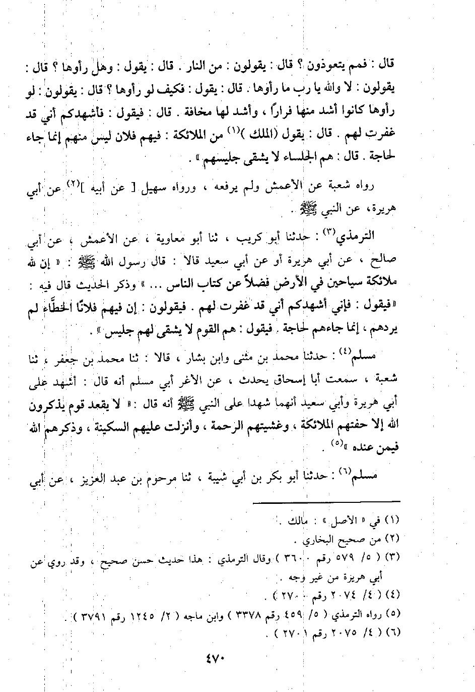 التِّرْمِذِيّ: حَدثنَا أَبُو كريب، ثَنَا أَبُو مُعَاوِيَة، عَن الْأَعْمَش، عَن أبي صَالح، عَن أبي هُرَيْرَة أَو عَن أبي سعيد قَالَا: قَالَ رَسُول الله - صَلَّى اللَّهُ عَلَيْهِ وَسَلَّم َ -: " إِن الله مَلَائِكَة سياحين فِي الأَرْض فضلا عَن كتاب النَّاس ... " وَذكر الحَدِيث قَالَ فِيهِ: " فَيَقُول: فَإِنِّي أشهدكم أَنِّي قد غفرت لَهُم. فَيَقُولُونَ: إِن فيهم فلَانا الخطاء لم يردهم إِنَّمَا جَاءَهُم لحَاجَة. فَيَقُول: هم الْقَوْم لَا يشقى لَهُم جليس ".
