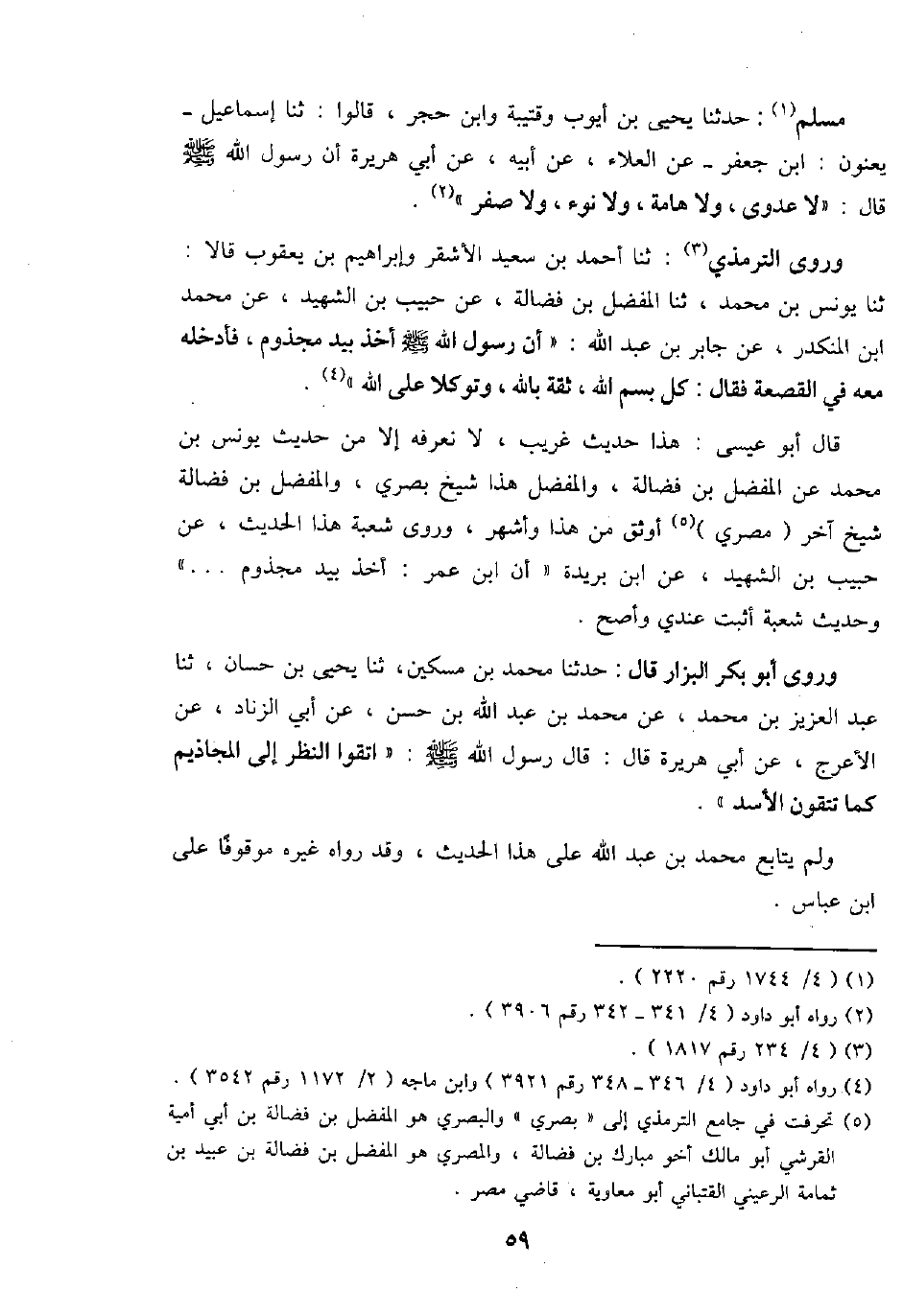 مُسلم: حَدثنَا يحيى بن أَيُّوب وقتيبة وَابْن حجر، قَالُوا: ثَنَا إِسْمَاعِيل - يعنون: ابْن جَعْفَر - عَن الْعَلَاء، عَن أَبِيه، عَن أبي هُرَيْرَة أَن رَسُول الله - صَلَّى اللَّهُ عَلَيْهِ وَسَلَّم َ - قَالَ: " لَا عدوى، وَلَا هَامة، وَلَا نوء، وَلَا صفر ".