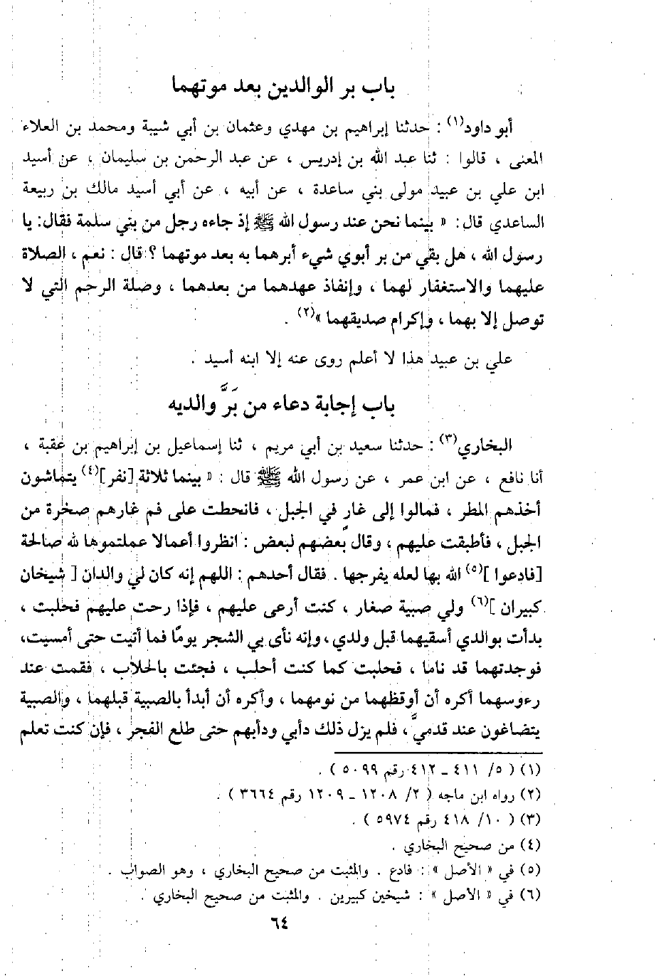 أَبُو دَاوُد: حَدثنَا إِبْرَاهِيم بن مهْدي وَعُثْمَان بن أبي شيبَة وَمُحَمّد بن الْعَلَاء الْمَعْنى، قَالُوا: ثَنَا عبد الله بن إِدْرِيس، عَن عبد الرَّحْمَن بن سُلَيْمَان، عَن أسيد ابْن عَليّ بن عبيد مولى بني سَاعِدَة، عَن أَبِيه، عَن أبي أسيد مَالك بن ربيعَة السَّاعِدِيّ قَالَ: " بَيْنَمَا نَحن عِنْد رَسُول الله - صَلَّى اللَّهُ عَلَيْهِ وَسَلَّم َ - إِذْ جَاءَهُ رجل من بني سَلمَة فَقَالَ: يَا رَسُول الله، هَل بَقِي من بر أَبَوي شَيْء أبرهما بِهِ بعد مَوْتهمَا؟ قَالَ: نعم، الصَّلَاة عَلَيْهِمَا وَالِاسْتِغْفَار لَهما، وإنفاذ عهدهما من بعدهمَا، وصلَة الرَّحِم الَّتِي لَا توصل إِلَّا بهما، وإكرام صديقهما ".