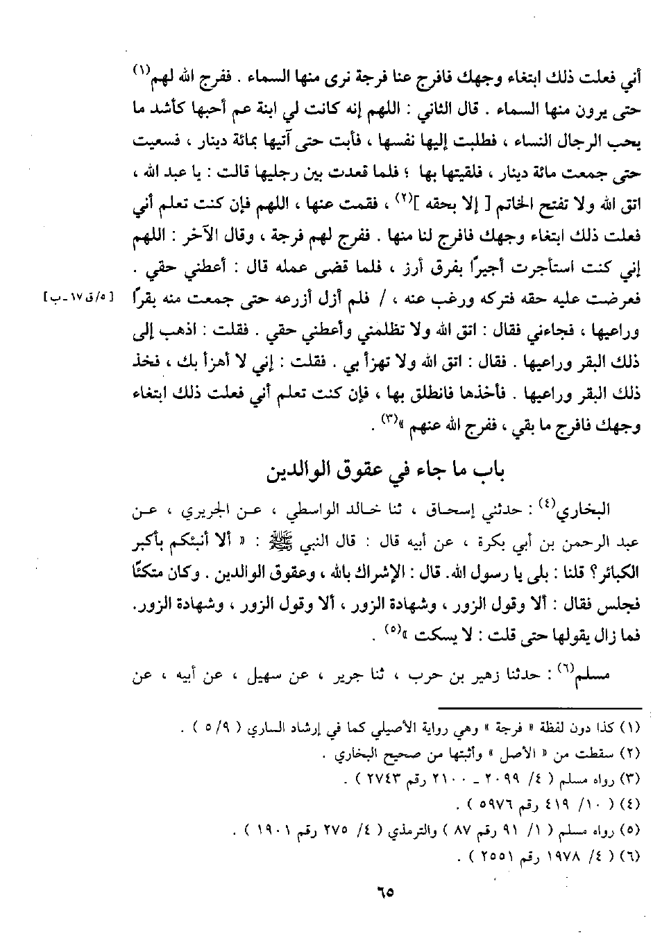 البُخَارِيّ: حَدثنِي إِسْحَاق، ثَنَا خَالِد الوَاسِطِيّ، عَن الْجريرِي، عَن عبد الرَّحْمَن بن أبي بكرَة، عَن أَبِيه قَالَ: قَالَ النَّبِي - صَلَّى اللَّهُ عَلَيْهِ وَسَلَّم َ -: " أَلا أنبئكم بأكبر الْكَبَائِر؟ قُلْنَا: بلَى يَا رَسُول الله. قَالَ: الْإِشْرَاك بِاللَّه، وعقوق الْوَالِدين. وَكَانَ مُتكئا فَجَلَسَ فَقَالَ: أَلا وَقَول الزُّور، وَشَهَادَة الزُّور، أَلا وَقَول الزُّور، وَشَهَادَة الزُّور. فَمَا زَالَ يَقُولهَا حَتَّى قلت: لَا يسكت ".