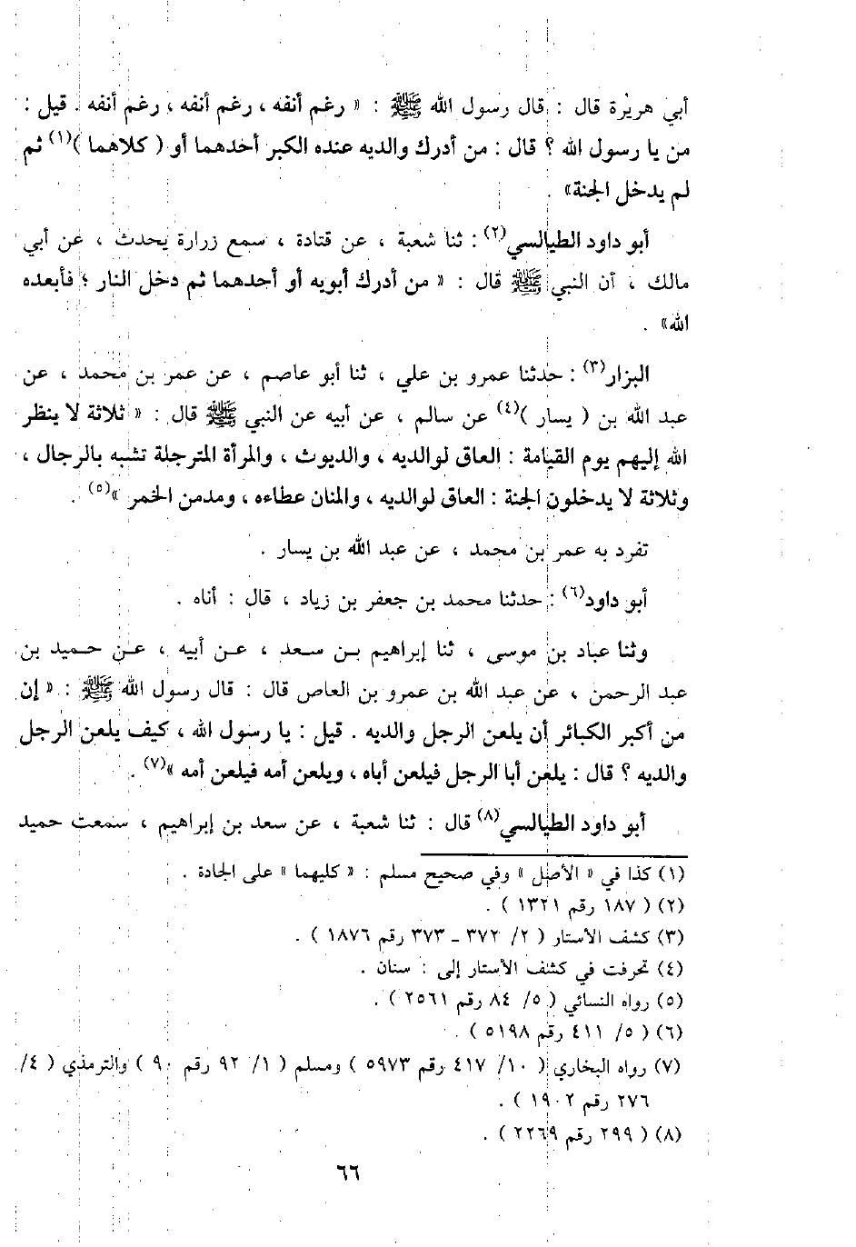 أَبُو دَاوُد الطَّيَالِسِيّ: ثَنَا شُعْبَة، عَن قَتَادَة، سمع زُرَارَة يحدث، عَن أبي مَالك، أَن النَّبِي - صَلَّى اللَّهُ عَلَيْهِ وَسَلَّم َ - قَالَ: " من أدْرك أَبَوَيْهِ أَو أحداهما ثمَّ دخل النَّار؛ فَأَبْعَده الله ". الْبَزَّار: حَدثنَا عَمْرو بن عَليّ، ثَنَا أَبُو عَاصِم، عَن عمر بن مُحَمَّد، عَن عبد الله بن (يسَار) عَن سَالم، عَن أَبِيه عَن النَّبِي - صَلَّى اللَّهُ عَلَيْهِ وَسَلَّم َ - قَالَ: " ثَلَاثَة لَا ينظر الله إِلَيْهِم يَوْم الْقِيَامَة: الْعَاق لوَالِديهِ، والديوث، وَالْمَرْأَة المترجلة تشبه بِالرِّجَالِ، وَثَلَاثَة لَا يدْخلُونَ الْجنَّة: الْعَاق لوَالِديهِ، والمنان عطاءه، ومدمن الْخمر ".
