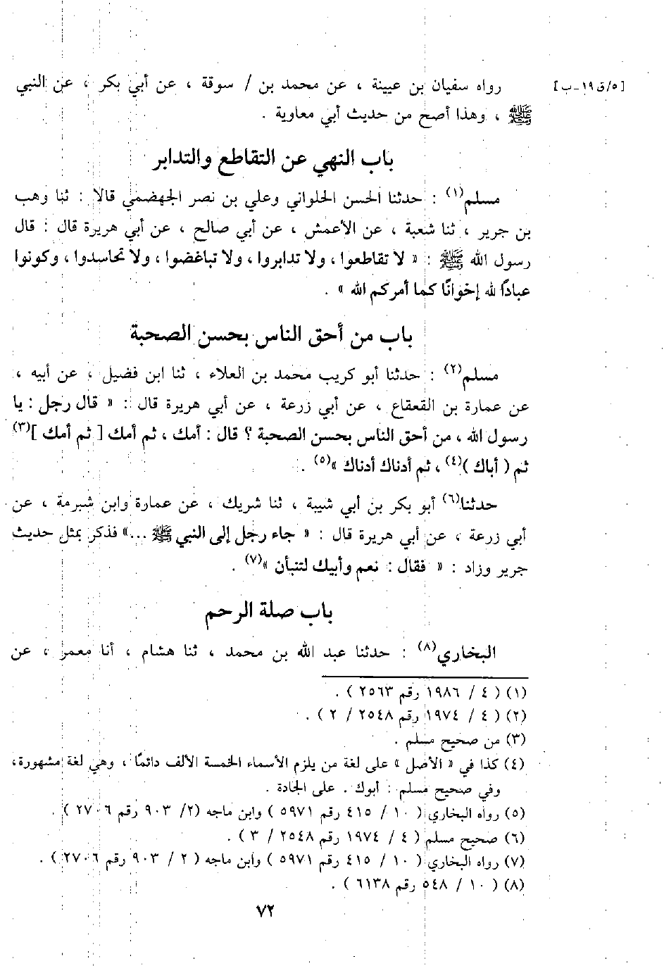 مُسلم: حَدثنَا الْحسن الْحلْوانِي وَعلي بن نصر الْجَهْضَمِي قَالَا: ثَنَا وهب بن جرير، ثَنَا شُعْبَة، عَن الْأَعْمَش، عَن أبي صَالح، عَن أبي هُرَيْرَة قَالَ: قَالَ رَسُول الله - صَلَّى اللَّهُ عَلَيْهِ وَسَلَّم َ -: " لَا تقاطعوا، وَلَا تدابروا، وَلَا تباغضوا، وَلَا تَحَاسَدُوا، وَكُونُوا عباداً لله إخْوَانًا كَمَا أَمركُم الله "