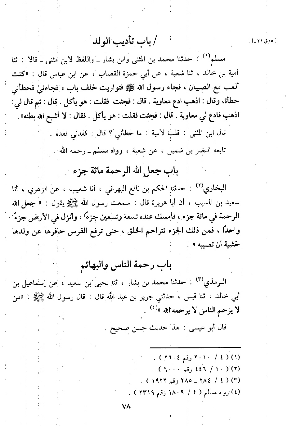 البُخَارِيّ: حَدثنَا الحكم بن نَافِع البهراني، أَنا شُعَيْب، عَن الزُّهْرِيّ، أَنا سعيد بن الْمسيب، أَن أَبَا هُرَيْرَة قَالَ: سَمِعت رَسُول الله - صَلَّى اللَّهُ عَلَيْهِ وَسَلَّم َ - يَقُول: " جعل الله الرَّحْمَة فِي مائَة جُزْء، فَأمْسك عِنْده تِسْعَة وَتِسْعين جُزْءا، وَأنزل فِي الأَرْض جُزْءا وَاحِدًا، فَمن ذَلِك الْجُزْء تتراحم الْخلق، حَتَّى ترفع الْفرس حافرها عَن وَلَدهَا خشيَة أَن تصيبه ".