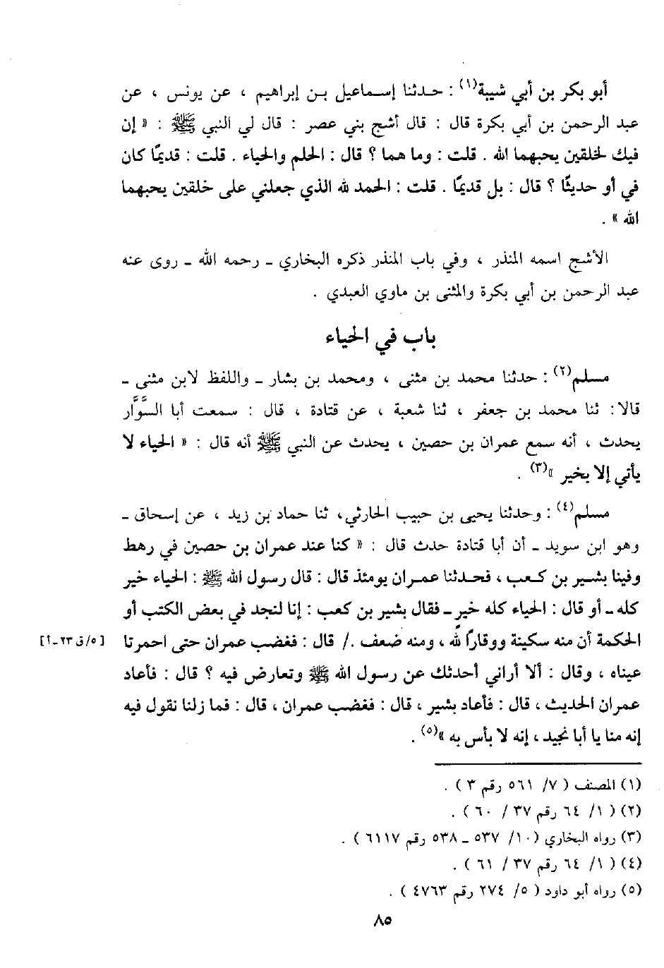 أَبُو بكر بن أبي شيبَة: حَدثنَا إِسْمَاعِيل بن إِبْرَاهِيم، عَن يُونُس، عَن عبد الرَّحْمَن بن أبي بكرَة قَالَ: قَالَ أشج بني عصر: قَالَ لي النَّبِي - صَلَّى اللَّهُ عَلَيْهِ وَسَلَّم َ -: " إِن فِيك لخلقين يحبهما الله. قلت: وَمَا هما؟ قَالَ: الْحلم وَالْحيَاء. قلت: قَدِيما كَانَ فِي أَو حَدِيثا؟ قَالَ:: بل قَدِيما. قلت: الْحَمد لله الَّذِي جعلني على خلقين يحبهما الله ".