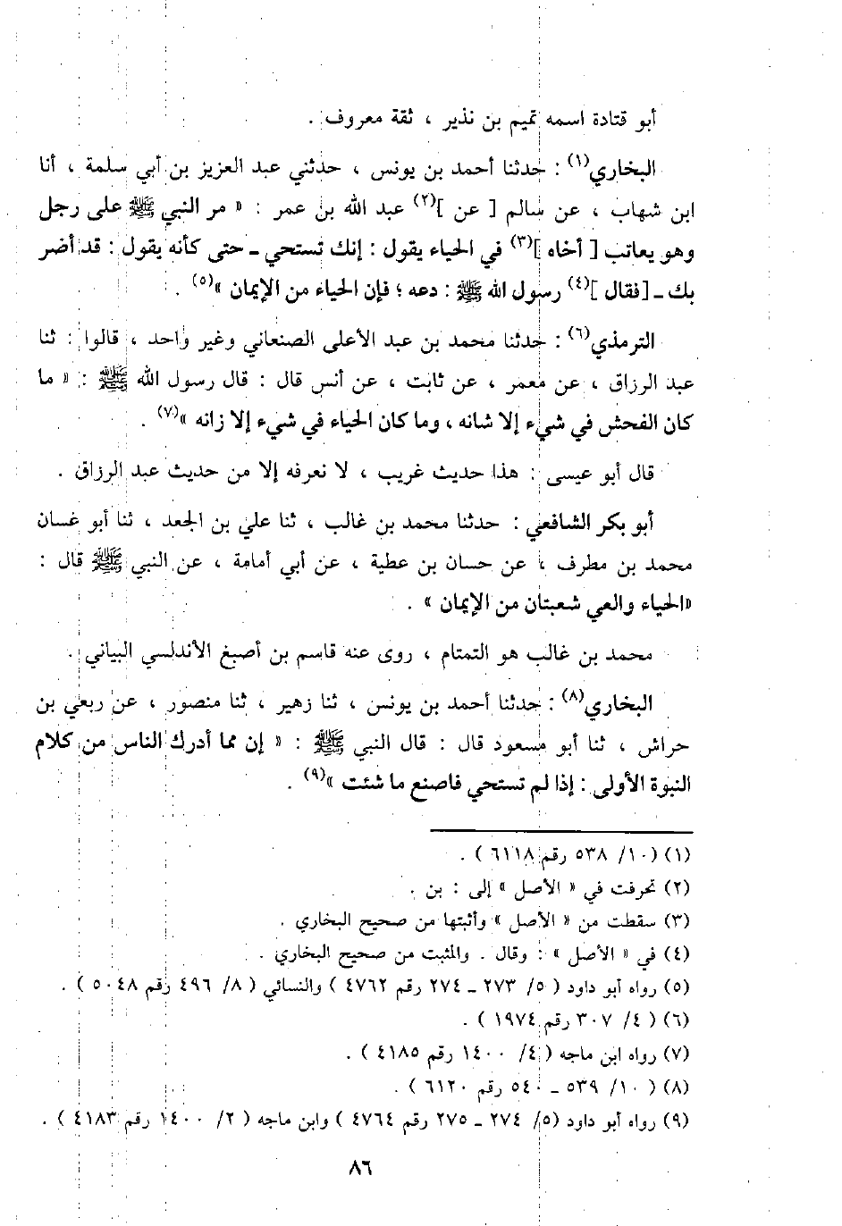 البُخَارِيّ: حثنا أَحْمد بن يُونُس، حَدثنِي عبد الْعَزِيز بن أبي سَلمَة، أَنا ابْن شهَاب، عَن سَالم [عَن] عبد الله بن عمر: " مر النَّبِي - صَلَّى اللَّهُ عَلَيْهِ وَسَلَّم َ - على رجل وَهُوَ يُعَاتب [أَخَاهُ] فِي الْحيَاء يَقُول: إِنَّك تَسْتَحي - حَتَّى كَأَنَّهُ يَقُول: قد أضرّ بك -[فَقَالَ] رَسُول الله - صَلَّى اللَّهُ عَلَيْهِ وَسَلَّم َ -: دَعه؛ فَإِن الْحيَاء من الْإِيمَان ".
