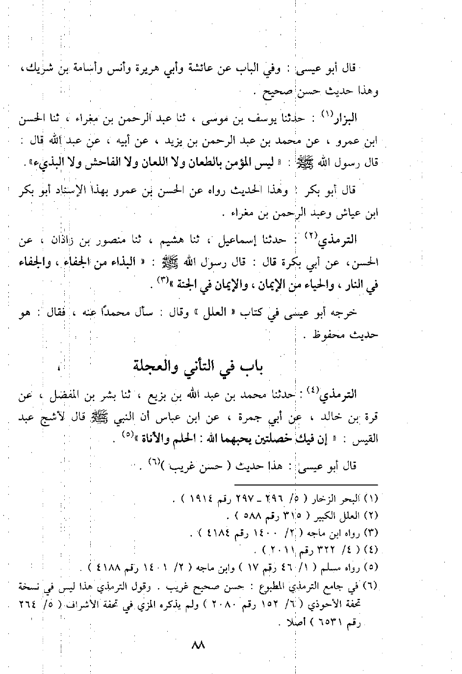 التِّرْمِذِيّ: حَدثنَا مُحَمَّد بن عبد الله بن بزيع، ثَنَا بشر بن الْمفضل، عَن قُرَّة بن خَالِد، عَن أبي جَمْرَة، عَن ابْن عَبَّاس أَن النَّبِي - صَلَّى اللَّهُ عَلَيْهِ وَسَلَّم َ - قَالَ لأشج عبد الْقَيْس: " إِن فِيك خَصْلَتَيْنِ يحبهما الله: الْحلم والأناة ".