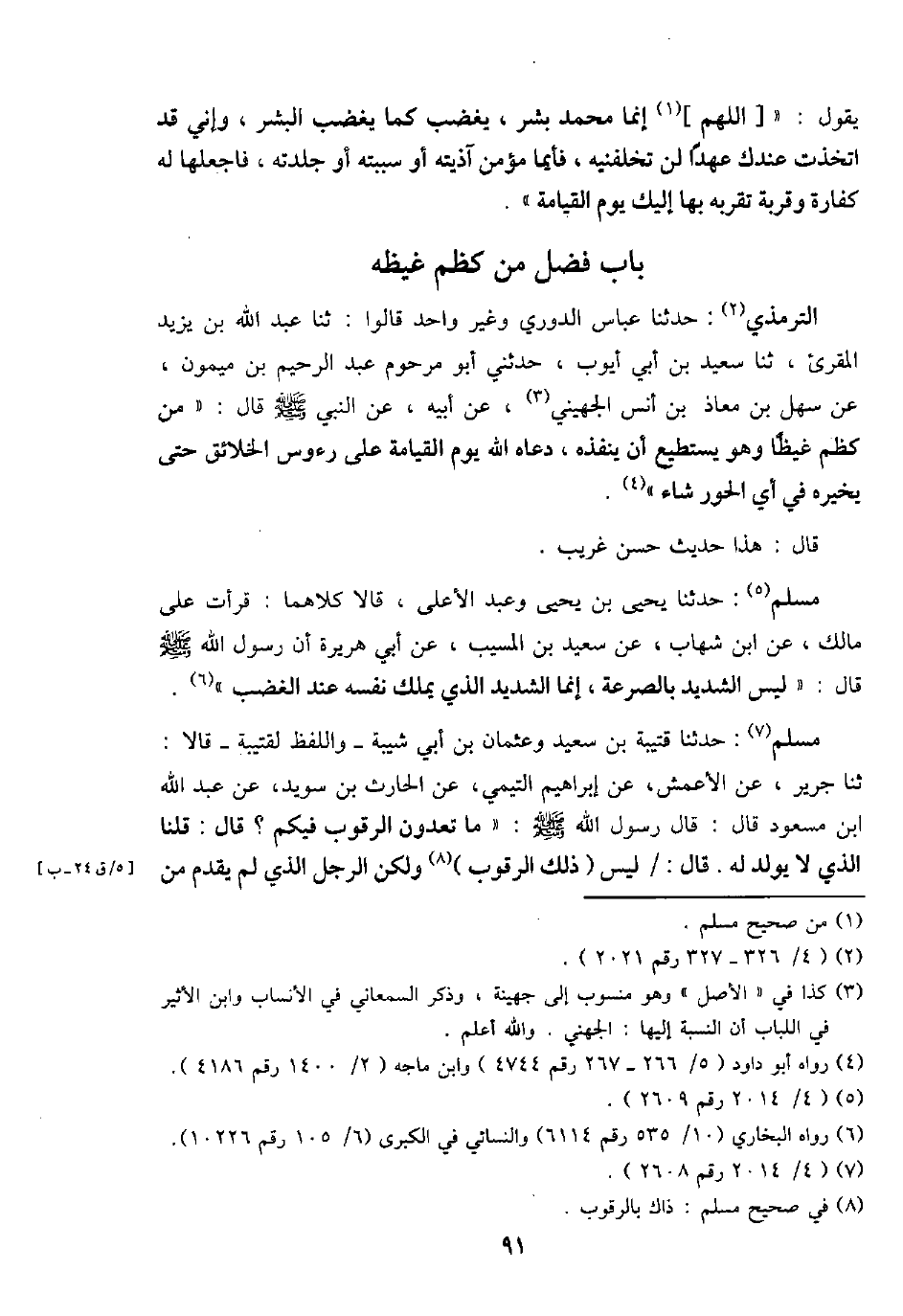التِّرْمِذِيّ: حَدثنَا عَبَّاس الدوري وَغير وَاحِد قَالُوا: ثَنَا عبد الله بن يزِيد الْمُقْرِئ، ثَنَا سعيد بن أبي أَيُّوب، حَدثنِي أَبُو مَرْحُوم عبد الرَّحِيم بن مَيْمُون، عَن سهل بن معَاذ بن أنس الجهيني، عَن أَبِيه، عَن النَّبِي - صَلَّى اللَّهُ عَلَيْهِ وَسَلَّم َ - قَالَ: " من كظم غيظاً وَهُوَ يَسْتَطِيع أَن ينفذهُ، دَعَاهُ الله يَوْم الْقِيَامَة على رُءُوس الْخَلَائق حَتَّى يُخبرهُ فِي أَي الْحور شَاءَ ".