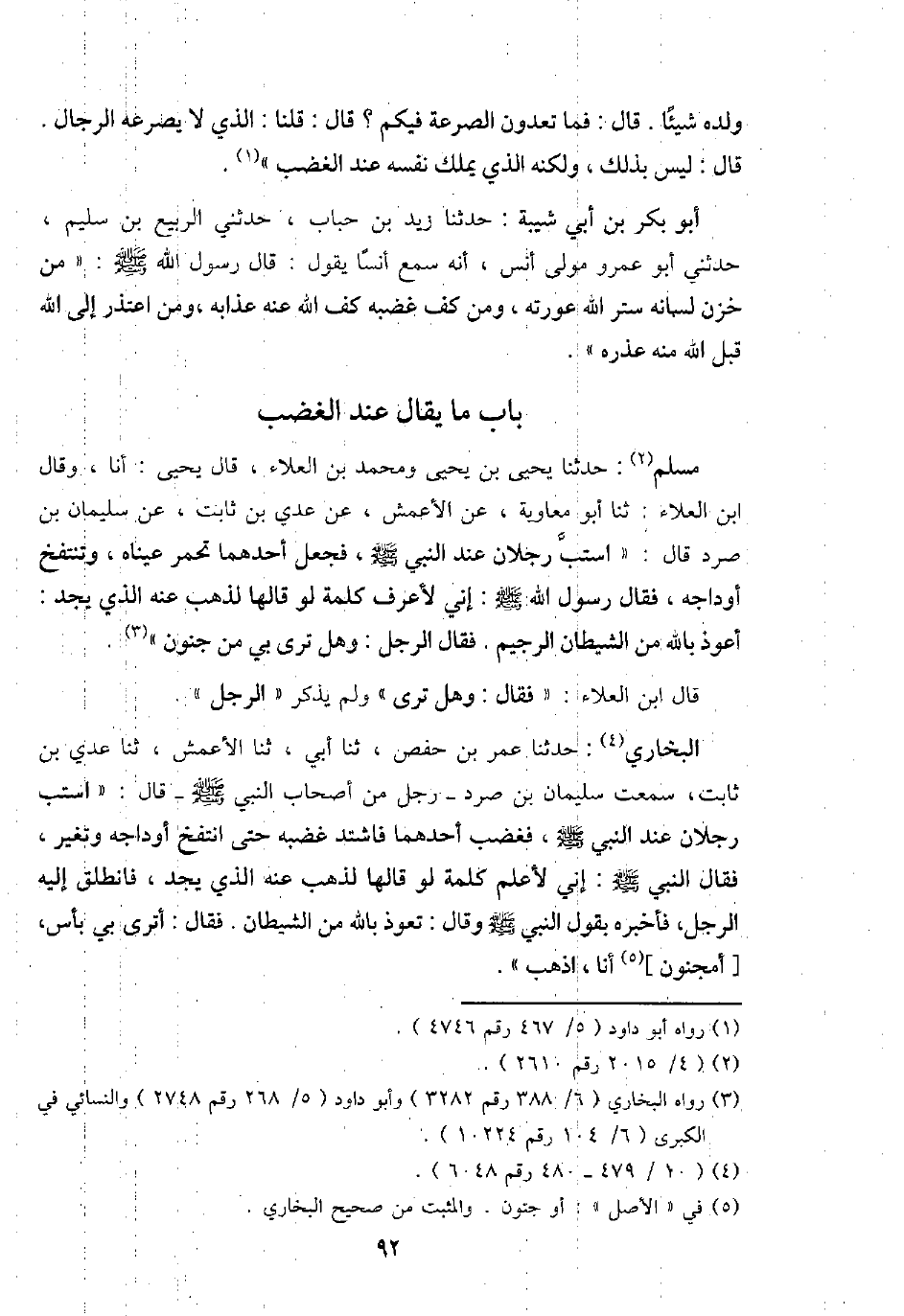 البُخَارِيّ: حَدثنَا عمر بن حَفْص، ثَنَا أبي، ثَنَا الْأَعْمَش، ثَنَا عدي بن ثَابت، سَمِعت سُلَيْمَان بن صرد - رجل من أَصْحَاب النَّبِي - صَلَّى اللَّهُ عَلَيْهِ وَسَلَّم َ - قَالَ: " استب رجلَانِ عَن النَّبِي - صَلَّى اللَّهُ عَلَيْهِ وَسَلَّم َ -، فَغَضب أَحدهمَا فَاشْتَدَّ غَضَبه حَتَّى انتفخ أوداجه وَتغَير، فَقَالَ النَّبِي - صَلَّى اللَّهُ عَلَيْهِ وَسَلَّم َ -: إِنِّي لأعْلم كلمة لَو قَالَهَا لذهب عَنهُ الَّذِي يجد، فَانْطَلق إِلَيْهِ الرجل، فَأخْبرهُ بقول النَّبِي - صَلَّى اللَّهُ عَلَيْهِ وَسَلَّم َ - وَقَالَ: تعوذ بِاللَّه من الشَّيْطَان. فَقَالَ: أَتَرَى بِي بَأْس، [أمجنون] أَنا، اذْهَبْ ".