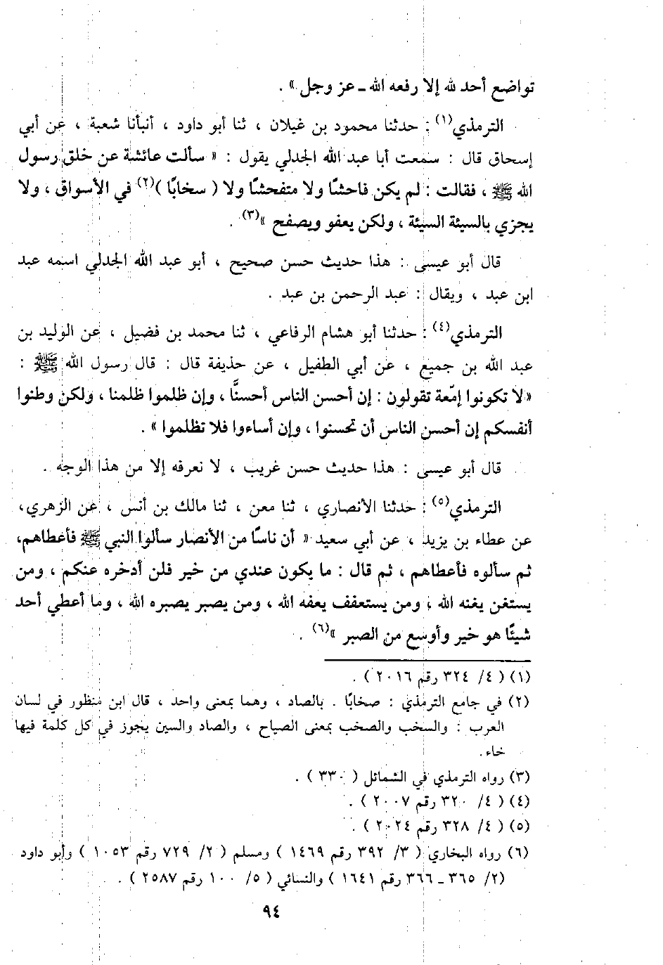 التِّرْمِذِيّ: حَدثنَا مَحْمُود بن غيلَان، ثَنَا أَبُو دَاوُد، أَنبأَنَا شُعْبَة، عَن أبي إِسْحَاق قَالَ: سَمِعت أَبَا عبد الله الجدلي يَقُول: " سَأَلت عَائِشَة عَن خلق رَسُول الله - صَلَّى اللَّهُ عَلَيْهِ وَسَلَّم َ -، فَقَالَت: لم يكن فَاحِشا وَلَا متفحشاً وَلَا (سخاباً) فِي الْأَسْوَاق، وَلَا يَجْزِي بِالسَّيِّئَةِ السَّيئَة، وَلَكِن يعْفُو ويصفح "