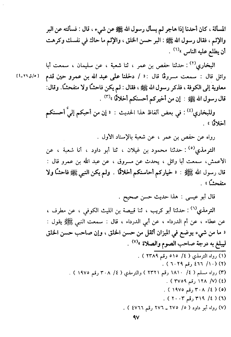التِّرْمِذِيّ: حَدثنَا مَحْمُود بن غيلَان، ثَنَا أَبُو دَاوُد، أَنا شُعْبَة، عَن الْأَعْمَش، سَمِعت أَبَا وَائِل، يحدث عَن مَسْرُوق، عَن عبد الله بن عَمْرو قَالَ: قَالَ رَسُول الله - صَلَّى اللَّهُ عَلَيْهِ وَسَلَّم َ -: " خياركم أحاسنكم أَخْلَاقًا. وَلم يكن النَّبِي - صَلَّى اللَّهُ عَلَيْهِ وَسَلَّم َ - فَاحِشا وَلَا متفحشاً ".