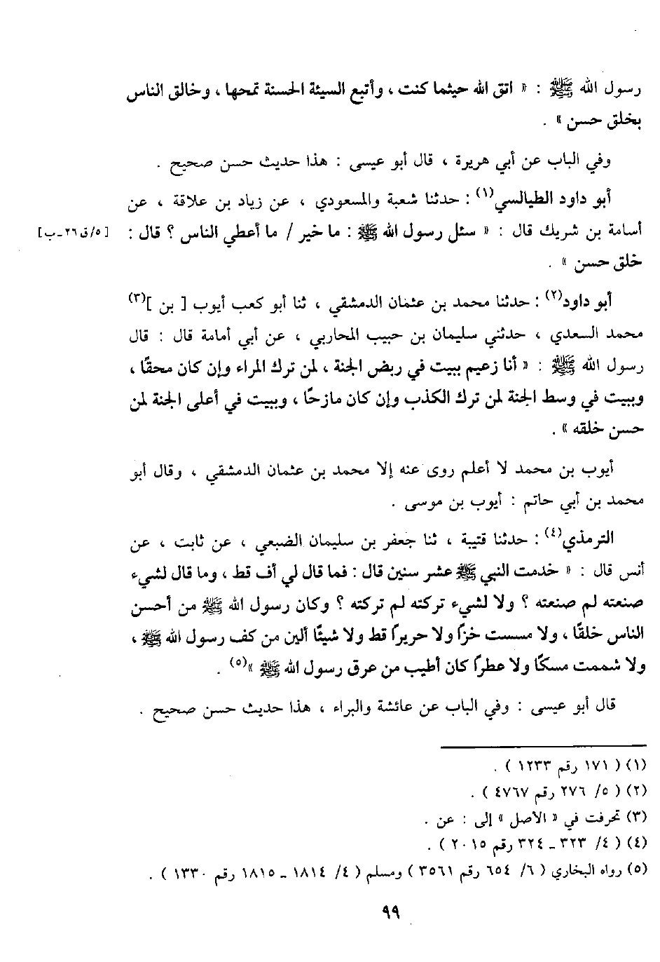 أَبُو دَاوُد الطَّيَالِسِيّ: حَدثنَا شُعْبَة والمسعودي، عَن زِيَاد بن علاقَة، عَن أُسَامَة بن شريك قَالَ: " سُئِلَ رَسُول الله - صَلَّى اللَّهُ عَلَيْهِ وَسَلَّم َ -: مَا خير مَا أعطي النَّاس؟ قَالَ: خلق حسن ".