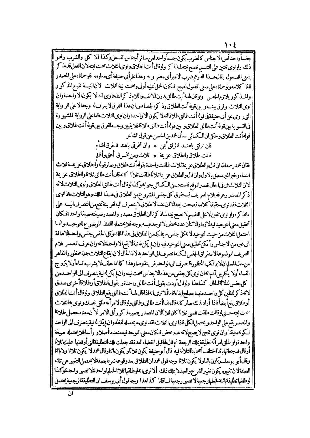وَكَذَا الْأَكْلُ وَالشُّرْبُ وَنَحْوُ ذَلِكَ، وَلَوْ نَوَى ثِنْتَيْنِ عَلَى التَّقْسِيمِ تَصِحُّ نِيَّتُهُ لِمَا نَذَرَ، وَلَوْ قَالَ: أَنْتِ الطَّلَاقُ وَنَوَى الثَّلَاثَ صَحَّتْ نِيَّتُهُ؛ لِأَنَّ الْفِعْلَ قَدْ يُذْكَرُ بِمَعْنَى الْمَفْعُولِ يُقَالُ: هَذَا الدِّرْهَمُ ضَرْبُ الْأَمِيرِ أَيْ: مَضْرُوبُهُ وَهَذَا عِلْمُ أَبِي حَنِيفَةَ أَيْ مَعْلُومُهُ فَلَوْ حَمَلْنَاهُ عَلَى الْمَصْدَرِ لَلَغَا كَلَامُهُ، وَلَوْ حَمَلْنَاهُ عَلَى مَعْنَى الْمَفْعُولِ لَصَحَّ فَكَانَ الْحَمْلُ عَلَيْهِ أَوْلَى وَصَحَّتْ نِيَّةُ الثَّلَاثِ؛ لِأَنَّ النِّيَّةَ تَتَّبِعُ الْمَذْكُورَ، وَالْمَذْكُورَ يُلَازِمُ الْجِنْسَ، وَلَوْ قَالَ لَهَا: أَنْتِ طَالِقٌ بِدُونِ الْأَلِفِ وَاللَّامِ ذَكَرَ الطَّحَاوِيُّ أَنَّهُ لَا يَكُونُ إلَّا وَاحِدَةً وَإِنْ نَوَى الثَّلَاثَ، وَفَرَّقَ بَيْنَهُ وَبَيْنَ قَوْلِهِ: أَنْتِ الطَّالِقُ وَذَكَرَ الْجَصَّاصُ: أَنَّ هَذَا الْفَرْقَ لَا يُعْرَفُ لَهُ وَجْهٌ إلَّا عَلَى الرِّوَايَةِ الَّتِي رَوَى عَنْ أَبِي حَنِيفَةَ فِي قَوْلِهِ: أَنْتِ طَالِقٌ طَلَاقًا أَنَّهُ لَا يَكُونُ إلَّا وَاحِدَةً وَإِنْ نَوَى الثَّلَاثَ،.