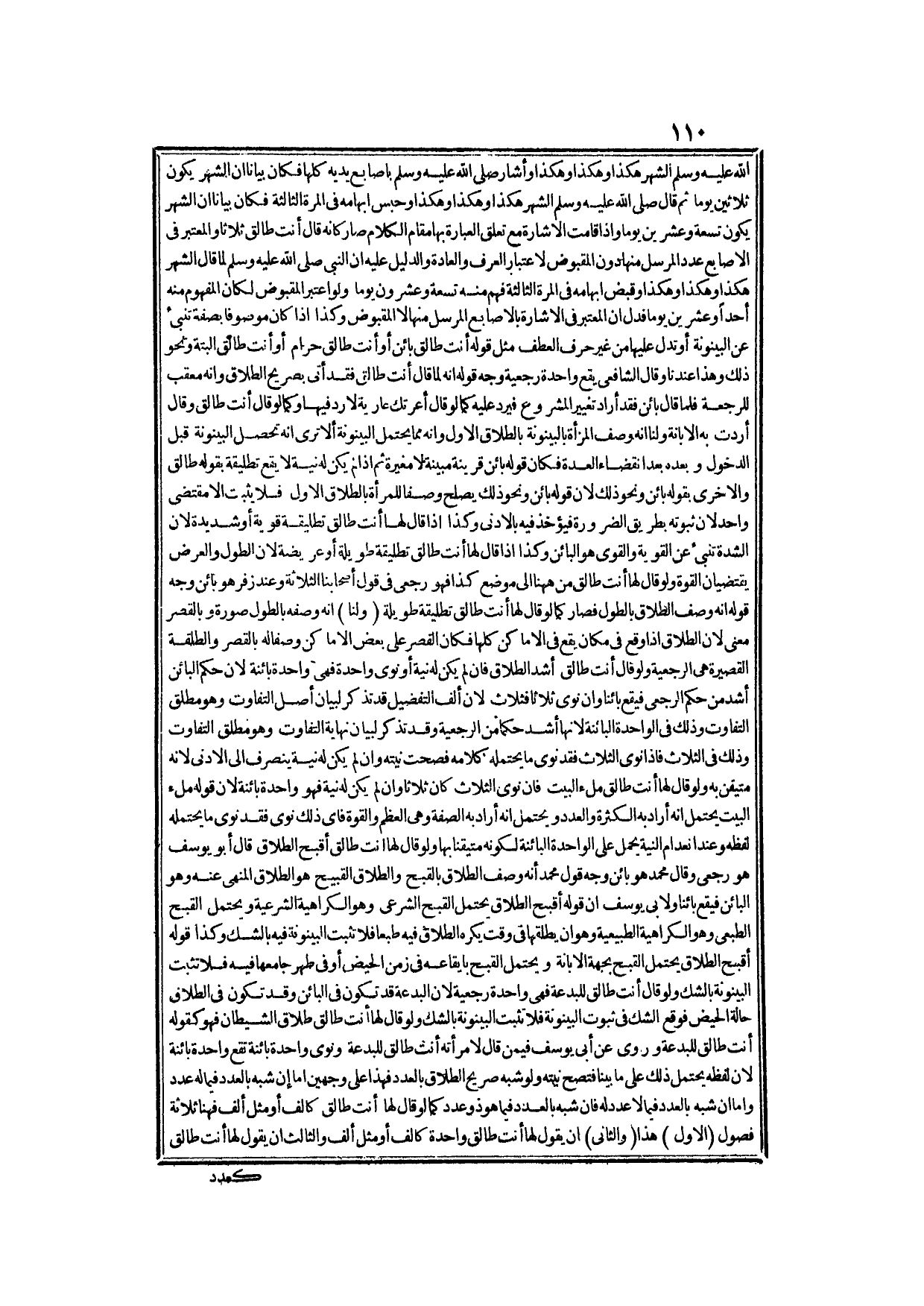 : «الشَّهْرُ هَكَذَا وَهَكَذَا وَهَكَذَا وَأَشَارَ - صَلَّى اللَّهُ عَلَيْهِ وَسَلَّمَ - بِأَصَابِعِ يَدَيْهِ كُلِّهَا» فَكَانَ بَيَانًا أَنَّ الشَّهْرَ يَكُونُ ثَلَاثِينَ يَوْمًا ثُمَّ قَالَ - صَلَّى اللَّهُ عَلَيْهِ وَسَلَّمَ -: «الشَّهْرُ هَكَذَا وَهَكَذَا وَهَكَذَا وَحَبَسَ إبْهَامَهُ فِي الْمَرَّةِ الثَّالِثَةِ» فَكَانَ بَيَانًا أَنَّ الشَّهْرَ يَكُونُ تِسْعَةً وَعِشْرِينَ يَوْمًا، وَإِذَا قَامَتْ الْإِشَارَةُ مَعَ تَعَلُّقِ الْعِبَارَةِ بِهَا مَقَامَ الْكَلَامِ صَارَ كَأَنَّهُ قَالَ: أَنْتِ طَالِقٌ ثَلَاثًا، وَالْمُعْتَبَرُ فِي الْأَصَابِعِ عَدَدُ الْمُرْسَلِ مِنْهَا دُونَ الْمَقْبُوضِ لِاعْتِبَارِ الْعُرْفِ وَالْعَادَةِ، وَالدَّلِيلُ عَلَيْهِ أَنَّ النَّبِيَّ - صَلَّى اللَّهُ عَلَيْهِ وَسَلَّمَ - لَمَّا قَالَ: الشَّهْرُ هَكَذَا وَهَكَذَا وَهَكَذَا وَقَبَضَ إبْهَامَهُ فِي الْمَرَّةِ الثَّالِثَةِ فُهِمَ مِنْهُ تِسْعَةٌ وَعِشْرُونَ يَوْمًا، وَلَوْ اُعْتُبِرَ الْمَقْبُوضُ لَكَانَ الْمَفْهُومُ مِنْهُ أَحَدًا وَعِشْرِينَ يَوْمًا فَدَلَّ أَنَّ الْمُعْتَبَرَ فِي الْإِشَارَةِ بِالْأَصَابِعِ الْمُرْسَلُ مِنْهَا لَا الْمَقْبُوضُ.