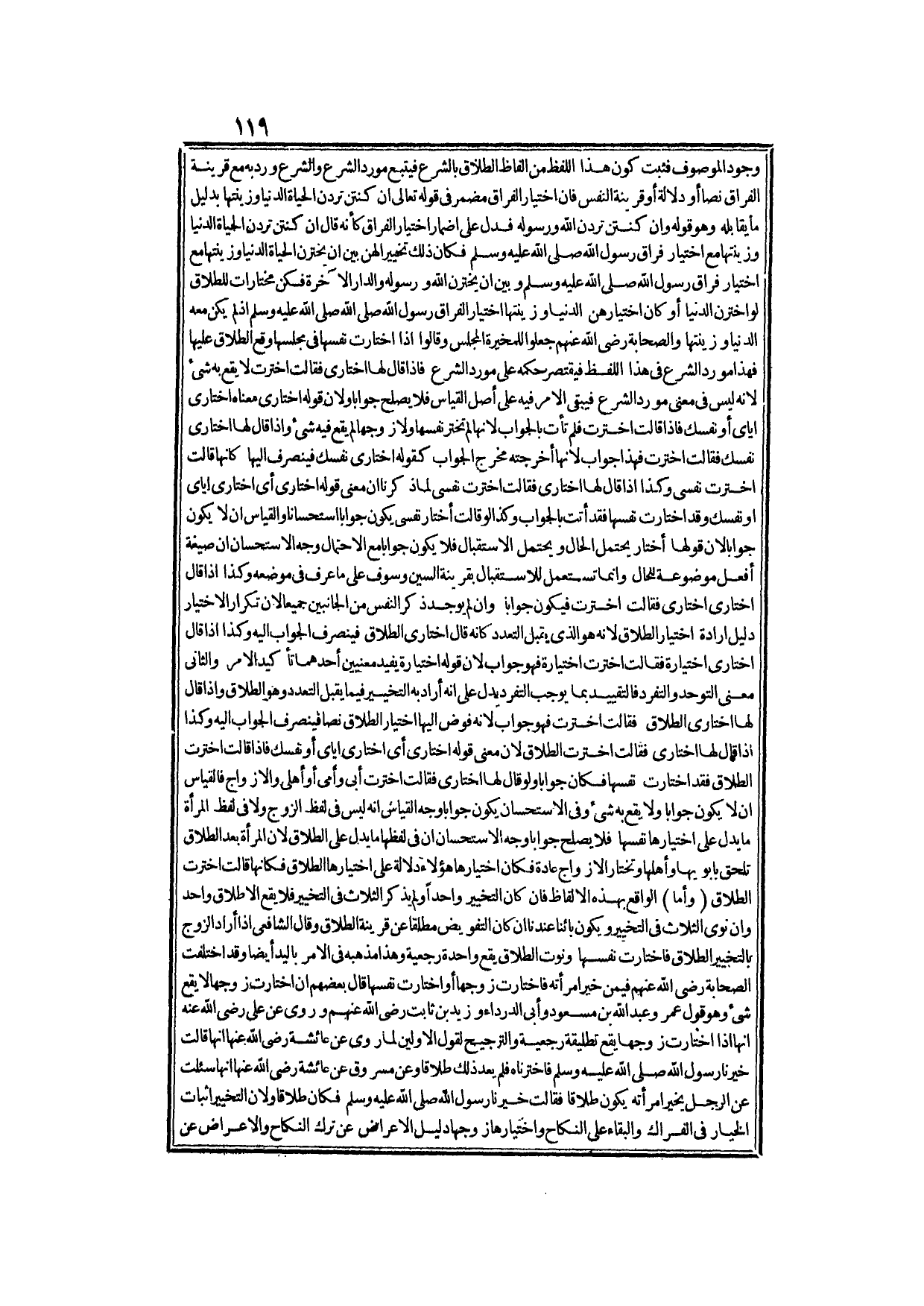 وُجُودَ الْمَوْصُوفِ فَثَبَتَ كَوْنُ هَذَا اللَّفْظِ مِنْ أَلْفَاظِ الطَّلَاقِ بِالشَّرْعِ فَيُتَّبَعُ مَوْرِدُ الشَّرْعِ، وَالشَّرْعُ وَرَدَ بِهِ مَعَ قَرِينَةِ الْفِرَاقِ نَصًّا أَوْ دَلَالَةً أَوْ قَرِينَةِ النَّفْسِ فَإِنَّ اخْتِيَارَ الْفِرَاقِ مُضْمَرٌ فِي قَوْله تَعَالَى {إِنْ كُنْتُنَّ تُرِدْنَ الْحَيَاةَ الدُّنْيَا وَزِينَتَهَا} [الأحزاب: 28] بِدَلِيلِ مَا يُقَابِلُهُ وَهُوَ قَوْلُهُ: {وَإِنْ كُنْتُنَّ تُرِدْنَ اللَّهَ وَرَسُولَهُ} [الأحزاب: 29] فَدَلَّ عَلَى إضْمَارِ اخْتِيَارِ الْفِرَاقِ كَأَنَّهُ قَالَ {إِنْ كُنْتُنَّ تُرِدْنَ الْحَيَاةَ الدُّنْيَا وَزِينَتَهَا} [الأحزاب: 28] مَعَ اخْتِيَارِ فِرَاقِ رَسُولِ اللَّهِ - صَلَّى اللَّهُ عَلَيْهِ وَسَلَّمَ - فَكَانَ ذَلِكَ تَخْيِيرًا لَهُنَّ بَيْنَ أَنْ يَخْتَرْنَ الْحَيَاةَ الدُّنْيَا وَزِينَتَهَا مَعَ اخْتِيَارِ فِرَاقِ رَسُولِ اللَّهِ - صَلَّى اللَّهُ عَلَيْهِ وَسَلَّمَ - وَبَيْنَ أَنْ يَخْتَرْنَ اللَّهَ وَرَسُولَهُ وَالدَّارَ الْآخِرَةَ فَكُنَّ مُخْتَارَاتٍ لِلطَّلَاقِ لَوْ اخْتَرْنَ الدُّنْيَا أَوْ كَانَ اخْتِيَارُهُنَّ الدُّنْيَا وَزْنِيَّتهَا اخْتِيَارًا لِفِرَاقِ رَسُولِ اللَّهِ - صَلَّى اللَّهُ عَلَيْهِ وَسَلَّمَ - إذْ لَمْ يَكُنْ مَعَهُ الدُّنْيَا وَزِينَتُهَا.