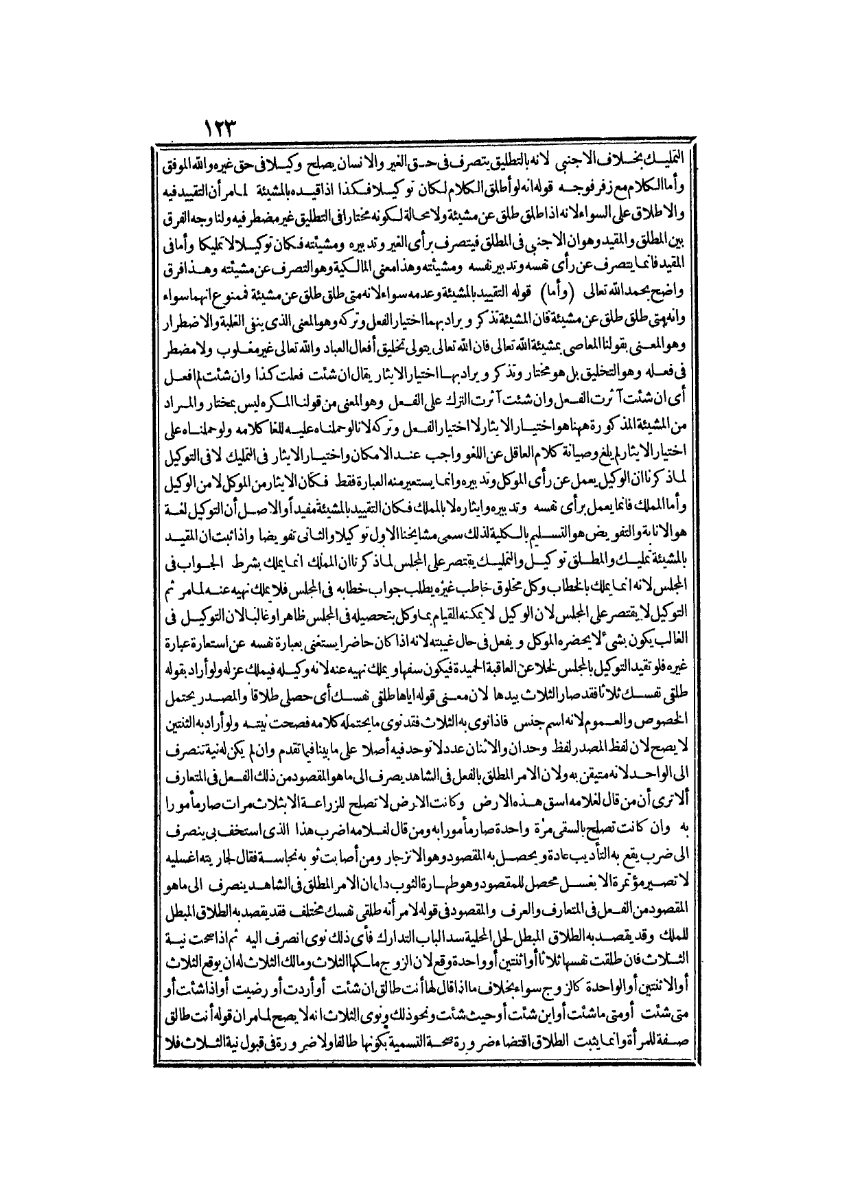 (وَأَمَّا) قَوْلُهُ: التَّقْيِيدُ بِالْمَشِيئَةِ وَعَدَمُهُ سَوَاءٌ؛ لِأَنَّهُ مَتَى طَلَّقَ طَلَّقَ عَنْ مَشِيئَةٍ، فَمَمْنُوعٌ أَنَّهُمَا سَوَاءٌ، وَأَنَّهُ مَتَى طَلَّقَ طَلَّقَ عَنْ مَشِيئَةٍ؛ فَإِنَّ الْمَشِيئَةَ تُذْكَرُ وَيُرَادُ بِهِمَا اخْتِيَارُ الْفِعْلِ وَتَرْكُهُ وَهُوَ الْمَعْنَى الَّذِي يَنْفِي الْغَلَبَةَ وَالِاضْطِرَارَ وَهُوَ الْمَعْنِيُّ بِقَوْلِنَا: الْمَعَاصِي بِمَشِيئَةِ اللَّهِ تَعَالَى، فَإِنَّ اللَّهَ تَعَالَى يَتَوَلَّى تَخْلِيقَ أَفْعَالِ الْعِبَادِ وَاَللَّهُ تَعَالَى غَيْرُ مَغْلُوبٍ وَلَا مُضْطَرٍّ فِي فِعْلِهِ وَهُوَ التَّخْلِيقُ، بَلْ هُوَ مُخْتَارٌ، وَتُذْكَرُ وَيُرَادُ بِهَا اخْتِيَارُ الْإِيثَارِ يُقَالُ: إنْ شِئْتُ فَعَلْتُ كَذَا وَإِنْ شِئْتُ لَمْ أَفْعَلْ أَيْ: إنْ شِئْت آثَرْتُ الْفِعْلَ وَإِنْ شِئْتُ آثَرْتُ التَّرْكَ عَلَى الْفِعْلِ وَهُوَ الْمَعْنِيُّ مِنْ قَوْلِنَا: الْمُكْرَهُ لَيْسَ بِمُخْتَارٍ، وَالْمُرَادُ مِنْ الْمَشِيئَةِ الْمَذْكُورَةِ هَهُنَا هُوَ اخْتِيَارُ الْإِيثَارِ لَا اخْتِيَارُ الْفِعْلِ وَتَرْكِهِ؛ لِأَنَّا لَوْ حَمَلْنَاهُ عَلَيْهِ لَلَغَا كَلَامُهُ، وَلَوْ حَمَلْنَاهُ عَلَى اخْتِيَارِ الْإِيثَارِ لَمْ يَلْغُ، وَصِيَانَةُ كَلَامِ الْعَاقِلِ عَنْ اللَّغْوِ وَاجِبٌ عِنْدَ الْإِمْكَان، وَاخْتِيَارِ الْإِيثَارِ فِي التَّمْلِيكِ لَا فِي التَّوْكِيلِ لِمَا ذَكَرْنَا أَنَّ الْوَكِيلَ يَعْمَلُ عَنْ رَأْيِ الْمُوَكِّلِ وَتَدْبِيرِهِ، وَإِنَّمَا يَسْتَعِيرُ مِنْهُ الْعِبَارَةَ فَقَطْ فَكَانَ الْإِيثَارُ مِنْ الْمُوَكِّلِ لَا مِنْ الْوَكِيلِ.