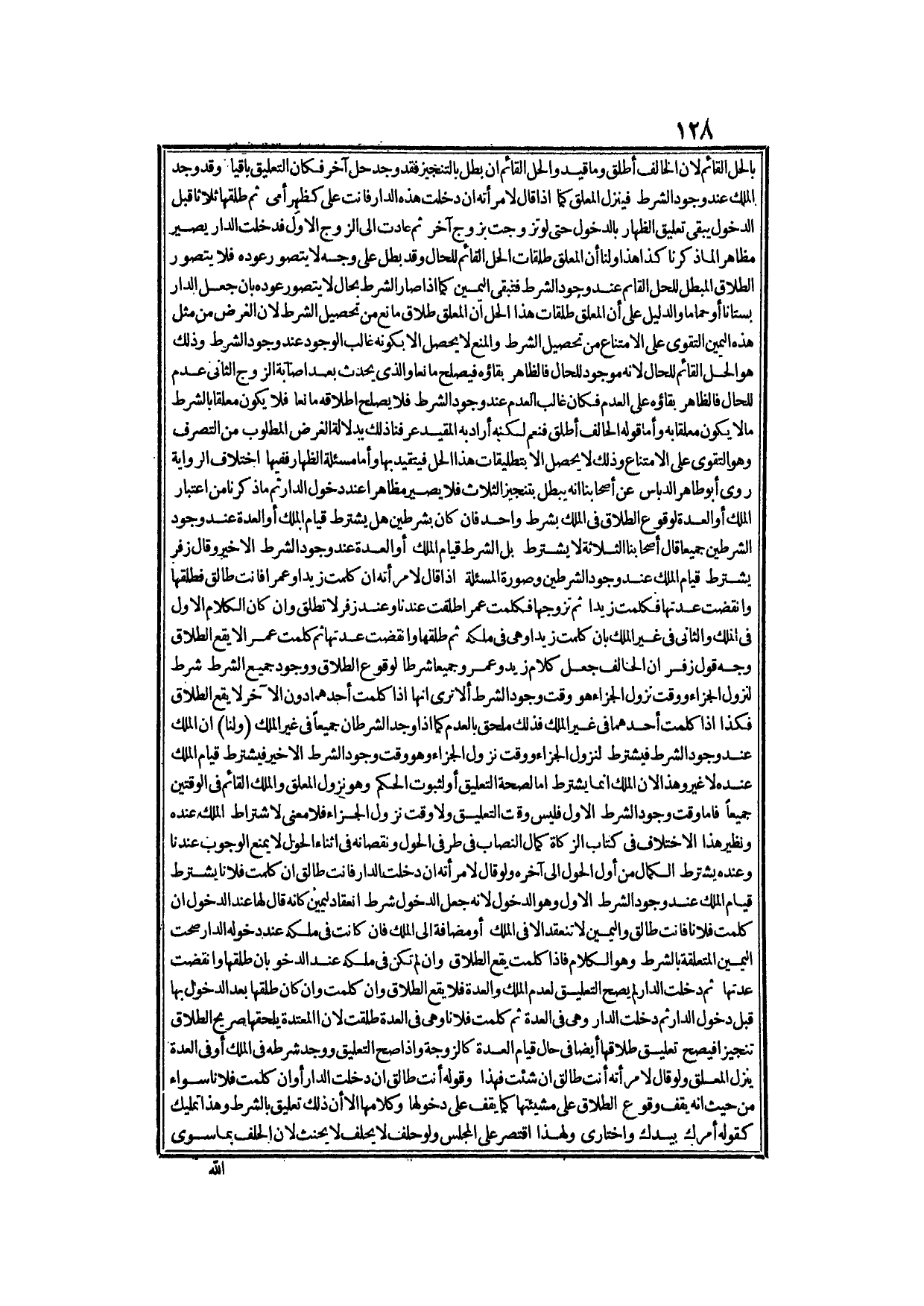 وَنَظِيرُ هَذَا الِاخْتِلَافِ فِي كِتَابِ الزَّكَاةِ: كَمَالُ النِّصَابِ فِي طَرَفَيْ الْحَوْلِ وَنُقْصَانِهِ فِي أَثْنَاءِ الْحَوْلِ لَا يَمْنَعُ الْوُجُوبَ عِنْدَنَا وَعِنْدَهُ يُشْتَرَطُ الْكَمَالُ مِنْ أَوَّلِ الْحَوْلِ إلَى آخِرِهِ، وَلَوْ قَالَ لِامْرَأَتِهِ: إنْ دَخَلْتِ الدَّارَ فَأَنْتِ طَالِقٌ إنْ كَلَّمْت فُلَانًا يُشْتَرَطُ قِيَامُ الْمِلْكِ عِنْدَ وُجُودِ الشَّرْطِ الْأَوَّلِ وَهُوَ الدُّخُولُ؛ لِأَنَّهُ جَعَلَ الدُّخُولَ شَرْطَ انْعِقَادِ الْيَمِينِ كَأَنَّهُ قَالَ لَهَا عِنْدَ الدُّخُولِ: إنْ كَلَّمْت فُلَانًا فَأَنْتِ طَالِقٌ، وَالْيَمِينُ لَا تَنْعَقِدُ إلَّا فِي الْمِلْكِ أَوْ مُضَافَةً إلَى الْمِلْكِ فَإِنْ كَانَتْ فِي مِلْكِهِ عِنْدَ دُخُولِهِ الدَّارَ صَحَّتْ الْيَمِينُ الْمُتَعَلِّقَةُ بِالشَّرْطِ وَهُوَ الْكَلَامُ، فَإِذَا كَلَّمَتْ يَقَعُ الطَّلَاقُ وَإِنْ لَمْ تَكُنْ فِي مِلْكِهِ عِنْدَ الدُّخُولِ بِأَنْ طَلَّقَهَا وَانْقَضَتْ عِدَّتُهَا ثُمَّ دَخَلَتْ الدَّارَ لَمْ يَصِحَّ التَّعْلِيقُ لِعَدَمِ الْمِلْكِ وَالْعِدَّةِ، فَلَا يَقَعُ الطَّلَاقُ وَإِنْ كَلَّمَتْ.