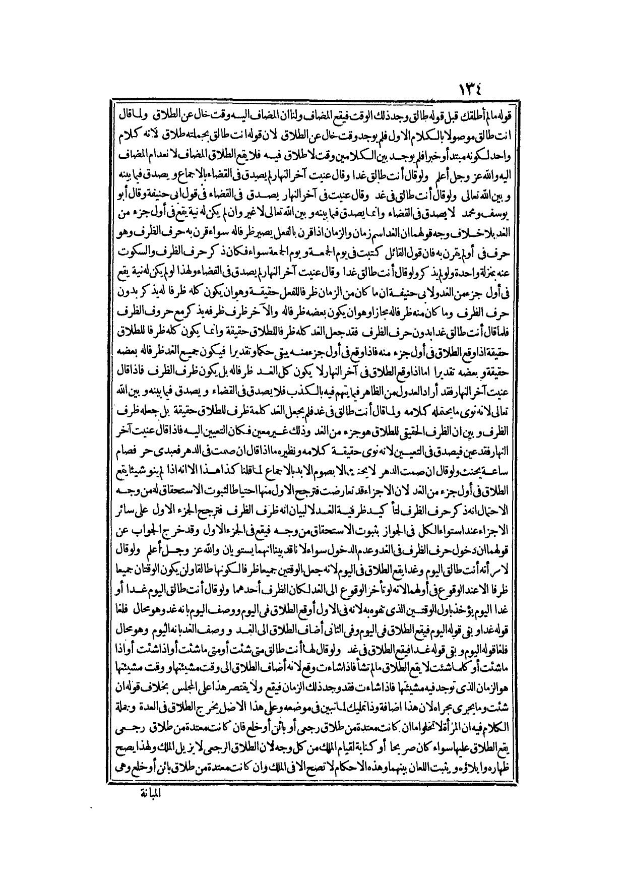 وَقَالَ: عَنَيْت آخِرَ النَّهَارِ لَمْ يُصَدَّقْ فِي الْقَضَاءِ؛ وَلِهَذَا لَوْ لَمْ يَكُنْ لَهُ نِيَّةٌ يَقَعُ فِي أَوَّلِ جُزْءٍ مِنْ الْغَدِ، وَلِأَبِي حَنِيفَةَ أَنَّ مَا كَانَ مِنْ الزَّمَانِ ظَرْفًا لِلْفِعْلِ حَقِيقَةً؛ وَهُوَ أَنْ يَكُونَ كُلُّهُ ظَرْفًا لَهُ يُذْكَرُ بِدُونِ حَرْفِ الظَّرْفِ، وَمَا كَانَ مِنْهُ ظَرْفًا لَهُ مَجَازًا وَهُوَ أَنْ يَكُونَ بَعْضُهُ ظَرْفًا لَهُ وَالْآخَرُ ظَرْفَ ظَرْفِهِ يُذْكَرُ مَعَ حُرُوفِ الظَّرْفِ، فَلَمَّا قَالَ: أَنْتِ طَالِقٌ غَدًا بِدُونِ حَرْفِ الظَّرْفِ فَقَدْ جَعَلَ الْغَدَ كُلَّهُ ظَرْفًا لِلطَّلَاقِ حَقِيقَةً، وَإِنَّمَا يَكُونُ كُلُّهُ ظَرْفًا لِلطَّلَاقِ حَقِيقَةً إذَا وَقَعَ الطَّلَاقُ فِي أَوَّلِ جُزْءٍ مِنْهُ، فَإِذَا وَقَعَ فِي أَوَّلِ جُزْءٍ مِنْهُ يَبْقَى حُكْمًا وَتَقْدِيرًا فَيَكُونُ جَمِيعُ الْغَدِ ظَرْفًا لَهُ بَعْضُهُ حَقِيقَةً وَبَعْضُهُ تَقْدِيرًا أَمَّا إذَا وَقَعَ الطَّلَاقُ فِي آخِرِ النَّهَارِ لَا يَكُونُ كُلُّ الْغَدِ ظَرْفًا لَهُ، بَلْ يَكُونُ ظَرْفَ الظَّرْفِ، فَإِذَا قَالَ: عَنَيْت آخِرَ النَّهَارِ فَقَدْ أَرَادَ الْعُدُولَ مِنْ الظَّاهِرِ فِيمَا يُتَّهَمُ فِيهِ بِالْكَذِبِ فَلَا يُصَدَّقُ فِي الْقَضَاءِ وَيُصَدَّقُ فِيمَا بَيْنَهُ وَبَيْنَ اللَّهِ تَعَالَى؛ لِأَنَّهُ نَوَى مَا يَحْتَمِلُهُ كَلَامُهُ، وَلَمَّا قَالَ: أَنْتِ طَالِقٌ فِي غَدٍ فَلَمْ يَجْعَلْ الْغَدَ كَلِمَةَ ظَرْفٍ لِلطَّلَاقِ حَقِيقَةً، بَلْ جَعَلَهُ ظَرْفَ الظَّرْفِ وَبَيَّنَ أَنَّ الظَّرْفَ الْحَقِيقِيَّ لِلطَّلَاقِ هُوَ جُزْءٌ مِنْ الْغَدِ.
