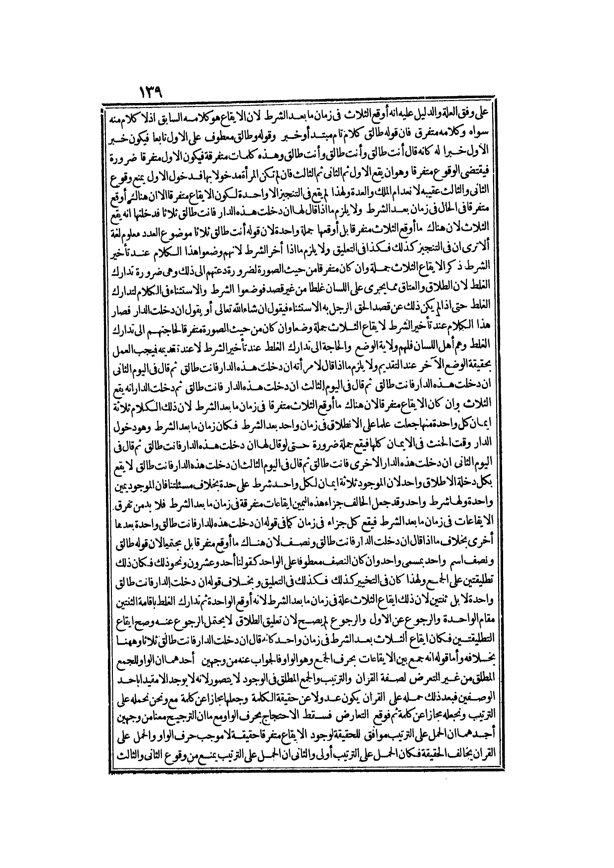 عَلَى وَفْقِ الْعِلَّةِ، وَالدَّلِيلُ عَلَيْهِ أَنَّهُ أَوْقَعَ الثَّلَاثَ فِي زَمَانِ مَا بَعْدَ الشَّرْطِ؛ لِأَنَّ الْإِيقَاعَ هُوَ كَلَامُهُ السَّابِقُ إذْ لَا كَلَامَ مِنْهُ سِوَاهُ، وَكَلَامُهُ مُتَفَرِّقٌ فَإِنَّ قَوْلَهُ: طَالِقٌ كَلَامٌ تَامٌّ مُبْتَدَأٌ وَخَبَرٌ، وَقَوْلُهُ: وَطَالِقٌ مَعْطُوفٌ عَلَى الْأَوَّلِ تَابِعًا فَيَكُونُ خَبَرُ الْأَوَّلِ خَبَرًا لَهُ كَأَنَّهُ قَالَ: أَنْتِ طَالِقٌ وَأَنْتِ طَالِقٌ وَأَنْتِ طَالِقٌ.