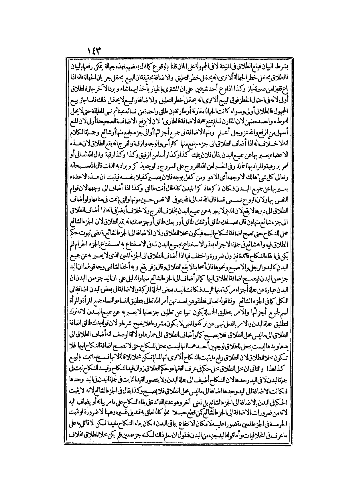 وَكَذَا يُقَالُ فِي الْجُزْءِ الشَّائِعِ؛ لِأَنَّهُ لَا يَثْبُتُ الْحُكْمُ فِي الْبَدَنِ بِالْإِضَافَةِ إلَى الْجُزْءِ الشَّائِعِ بَلْ لِمَعْنًى آخَرَ - وَهُوَ عَدَمُ الْفَائِدَةِ - فِي بَقَاءِ النِّكَاحِ عَلَى مَا مَرَّ بَيَانُهُ، أَوْ يُضَافُ إلَيْهِ؛ لِأَنَّهُ مِنْ ضَرُورَاتِ الْإِضَافَةِ إلَى الْجُزْءِ الشَّائِعِ كَمَنْ قَطَعَ حَبْلًا مَمْلُوكًا لَهُ تَعَلَّقَ بِهِ قِنْدِيلُ غَيْرِهِ وَهَهُنَا لَا ضَرُورَةَ لَمْ تَثْبُتْ الْحُرْمَةُ فِي الْجُزْءِ الْمُعَيَّن مَقْصُورًا عَلَيْهِ لِإِمْكَانِ الِانْتِفَاعِ بِبَاقِي الْبَدَنِ فَكَانَ بَقَاءُ النِّكَاحِ مُفِيدًا، لَكِنْ لَا قَائِلَ بِهِ عَلَى مَا عُرِفَ فِي الْخِلَافِيَّاتِ.