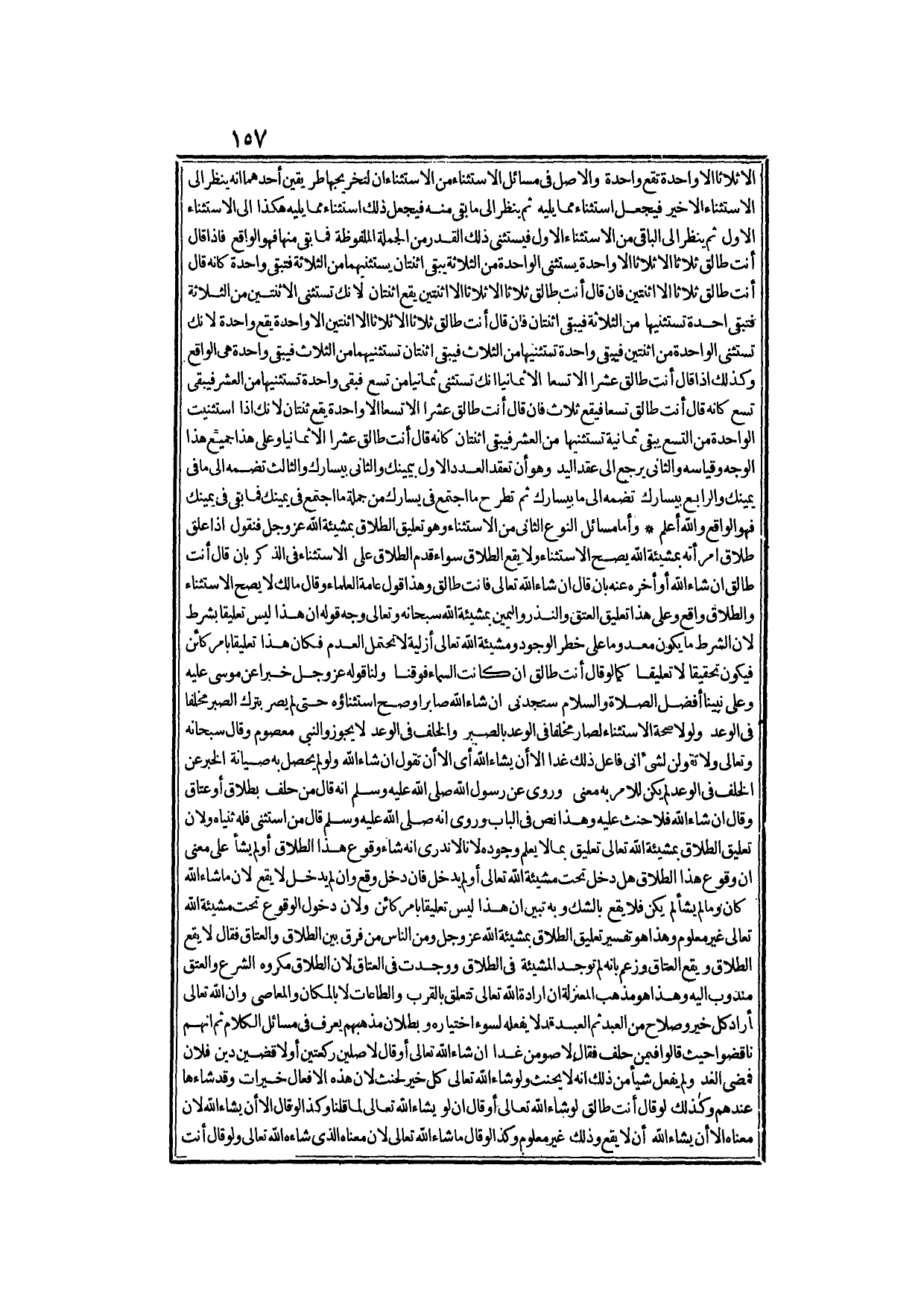 فَإِنْ قَالَ أَنْتِ طَالِقٌ ثَلَاثًا إلَّا ثَلَاثًا إلَّا اثْنَتَيْنِ إلَّا وَاحِدَةً يَقَعُ وَاحِدَةٌ؛ لِأَنَّك تَسْتَثْنِي الْوَاحِدَةَ مِنْ اثْنَتَيْنِ فَيَبْقَى وَاحِدَةٌ تَسْتَثْنِيهَا مِنْ الثَّلَاثِ فَيَبْقَى اثْنَتَانِ تَسْتَثْنِيهِمَا مِنْ الثَّلَاثِ فَيَبْقَى وَاحِدَةٌ هِيَ الْوَاقِعُ، وَكَذَلِكَ إذَا قَالَ أَنْتِ طَالِقٌ عَشْرًا إلَّا تِسْعًا إلَّا ثَمَانِيًا إنَّكَ تَسْتَثْنِي ثَمَانِيًا مِنْ تِسْعٍ فَبَقِيَ وَاحِدَةٌ نَسْتَثْنِيهَا مِنْ الْعَشْرِ فَيَبْقَى تِسْعٌ كَأَنَّهُ قَالَ: أَنْتِ طَالِقٌ تِسْعًا فَيَقَعُ ثَلَاثٌ فَإِنْ قَالَ: أَنْتِ طَالِقٌ عَشْرًا إلَّا تِسْعًا إلَّا وَاحِدَةً يَقَعُ ثِنْتَانِ؛ لِأَنَّك إذَا اسْتَثْنَيْت الْوَاحِدَةَ مِنْ التِّسْعِ يَبْقَى ثَمَانِيَةٌ تَسْتَثْنِيهَا مِنْ الْعَشْرِ فَيَبْقَى اثْنَتَانِ كَأَنَّهُ قَالَ: أَنْتِ طَالِقٌ عَشْرًا إلَّا ثَمَانِيًا، وَعَلَى هَذَا جَمِيعُ هَذَا الْوَجْهِ، وَقِيَاسُهُ، وَالثَّانِي يَرْجِعُ إلَى عَقْدِ الْيَدِ، وَهُوَ أَنْ تَعْقِدَ الْعَدَدَ الْأَوَّلَ بِيَمِينِكَ، وَالثَّانِي بِيَسَارِكَ، وَالثَّالِثَ تَضُمُّهُ إلَى مَا فِي يَمِينِك، وَالرَّابِعَ بِيَسَارِك تَضُمُّهُ إلَى مَا بِيَسَارِك ثُمَّ تَطْرَحُ مَا اجْتَمَعَ فِي يَسَارِكَ مِنْ جُمْلَةِ مَا اجْتَمَعَ فِي يَمِينِكَ فَمَا بَقِيَ فِي يَمِينِك فَهُوَ الْوَاقِعُ، وَاَللَّهُ أَعْلَمُ.