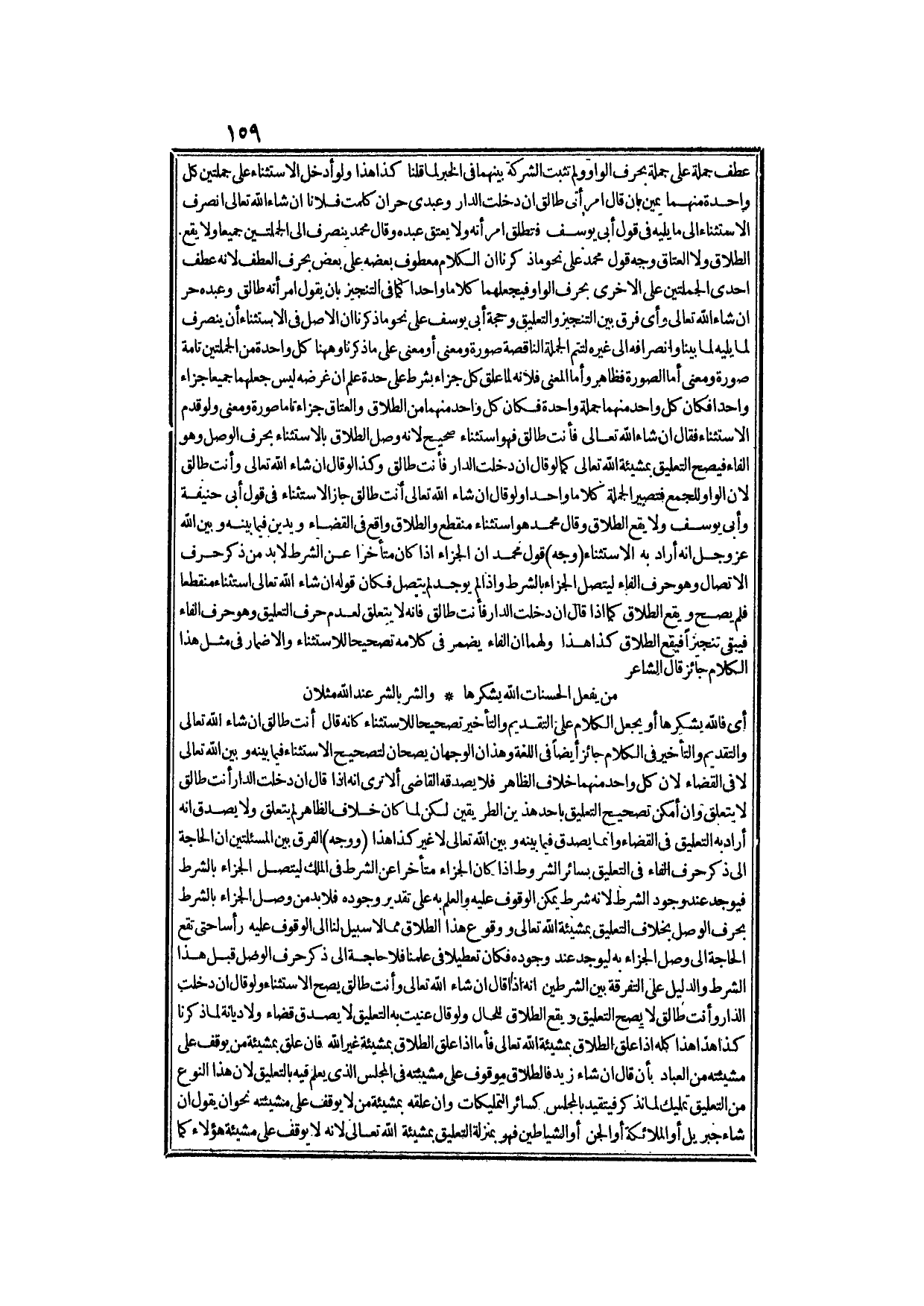 وَقَالَ مُحَمَّدٌ: هُوَ اسْتِثْنَاءٌ مُنْقَطِعٌ وَالطَّلَاقُ وَاقِعٌ فِي الْقَضَاءِ، وَيَدِينُ فِيمَا بَيْنَهُ، وَبَيْنَ اللَّهِ عَزَّ وَجَلَّ أَنَّهُ أَرَادَ بِهِ الِاسْتِثْنَاءَ (وَجْهُ) قَوْلِ مُحَمَّدٍ أَنَّ الْجَزَاءَ إذَا كَانَ مُتَأَخِّرًا عَنْ الشَّرْطِ لَا بُدَّ مِنْ ذِكْرِ حَرْفِ الِاتِّصَالِ - وَهُوَ حَرْفُ الْفَاءِ - لِيَتَّصِلَ الْجَزَاءُ بِالشَّرْطِ، وَإِذَا لَمْ يُوجَدْ لَمْ يَتَّصِلْ فَكَانَ قَوْلُهُ: إنْ شَاءَ اللَّهُ تَعَالَى اسْتِثْنَاءً مُنْقَطِعًا فَلَمْ يَصِحَّ، وَيَقَعُ الطَّلَاقُ كَمَا إذَا قَالَ: إنْ دَخَلْت الدَّارَ فَأَنْتِ طَالِقٌ فَإِنَّهُ لَا يَتَعَلَّقُ لِعَدَمِ حَرْفِ التَّعْلِيقِ - وَهُوَ حَرْفُ الْفَاءِ - فَيَبْقَى تَنْجِيزًا فَيَقَعُ الطَّلَاقُ كَذَا هَذَا، وَلَهُمَا أَنَّ الْفَاءَ يُضْمَرُ فِي كَلَامِهِ تَصْحِيحًا لِلِاسْتِثْنَاءِ وَالْإِضْمَارُ فِي مِثْلِ هَذَا الْكَلَامِ جَائِزٌ قَالَ الشَّاعِرُ