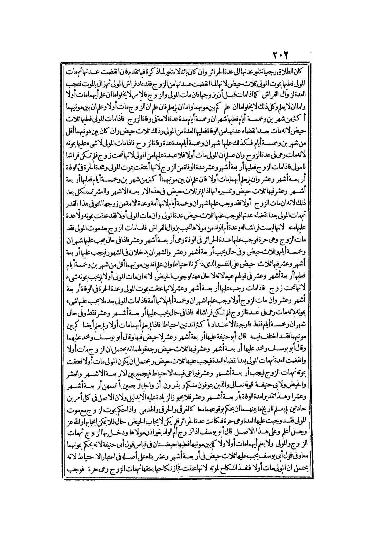 وَعَلَى هَذَا الْأَصْلِ قَالَ أَبُو يُوسُفَ: إذَا تَزَوَّجَ أُمَّ الْوَلَدِ بِغَيْرِ إذْنِ مَوْلَاهَا وَدَخَلَ بِهَا الزَّوْجُ ثُمَّ مَاتَ الزَّوْجُ وَالْمَوْلَى وَلَا يُعْلَمْ أَيُّهُمَا مَاتَ أَوَّلًا وَلَا كَمْ بَيْنَ مَوْتَيْهَا فَعَلَيْهَا حَيْضَتَانِ فِي قِيَاسِ قَوْلِ أَبِي حَنِيفَةَ؛ لِأَنَّهُ يُحْكَمُ بِمَوْتِهِمَا مَعًا، وَفِي قَوْلِ أَبِي يُوسُفَ يَجِبُ عَلَيْهَا ثَلَاثُ حِيَضٍ فِي أَرْبَعَةِ أَشْهُرٍ وَعَشْرٍ بِنَاءً عَلَى أَصْلِهِ فِي اعْتِبَارِ الِاحْتِيَاطِ؛ لِأَنَّهُ يَحْتَمِلُ أَنَّ الْمَوْلَى مَاتَ أَوَّلًا فَنَفَذَ النِّكَاحُ لِمَوْتِهِ؛ لِأَنَّهَا عَتَقَتْ فَجَازَ نِكَاحُهَا بِعِتْقِهَا ثُمَّ مَاتَ الزَّوْجُ وَهِيَ حُرَّةٌ فَوَجَبَ
