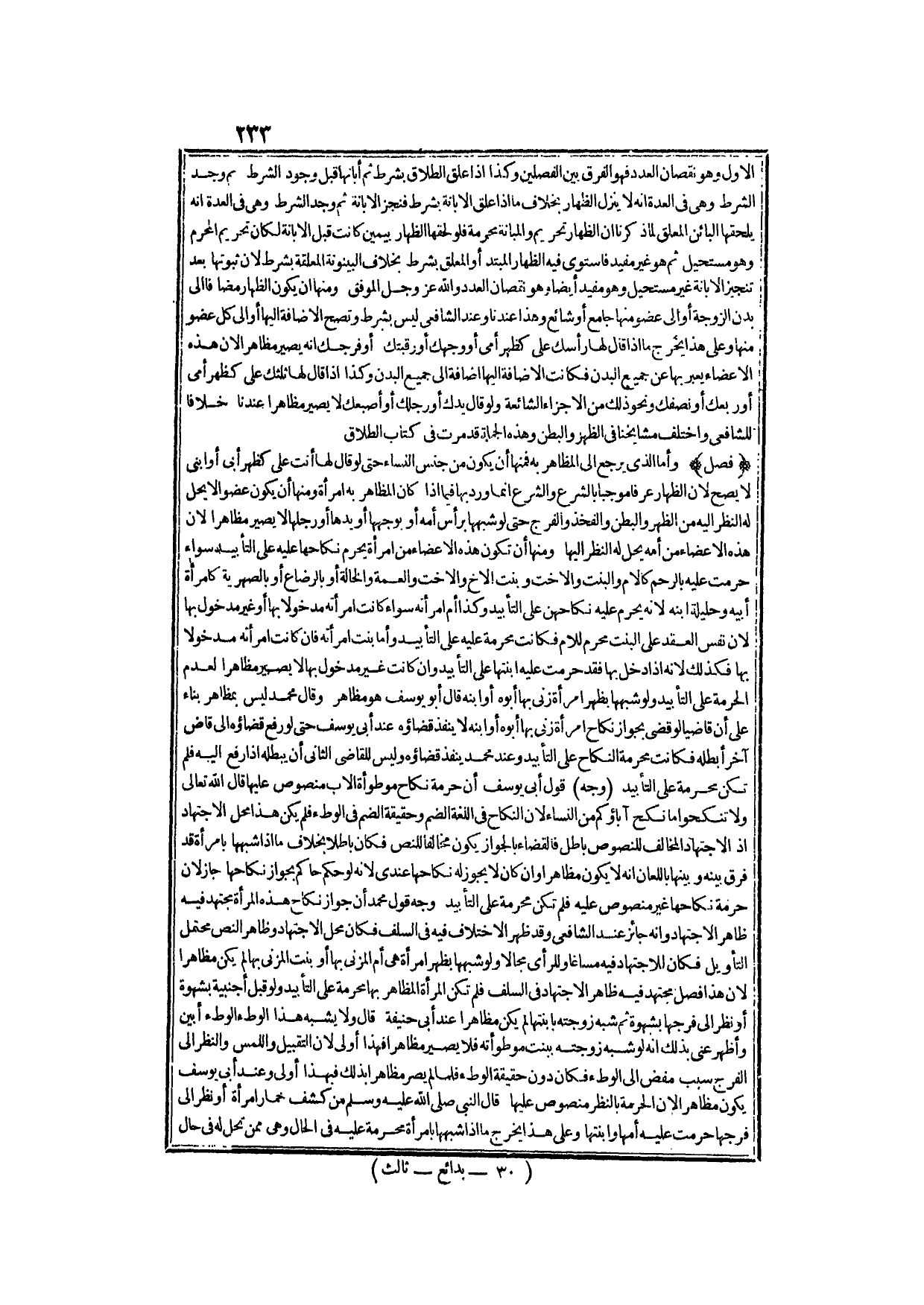 الْأَوَّلُ وَهُوَ نُقْصَانُ الْعَدَدِ فَهُوَ الْفَرْقُ بَيْنَ الْفَصْلَيْنِ وَكَذَا إذَا عَلَّقَ الطَّلَاقَ بِشَرْطٍ ثُمَّ أَبَانَهَا قَبْلَ وُجُودِ الشَّرْطِ ثُمَّ وُجِدَ الشَّرْطَ وَهِيَ فِي الْعِدَّةِ أَنَّهُ لَا يَنْزِلُ الظِّهَارُ بِخِلَافِ مَا إذَا عَلَّقَ الْإِبَانَةَ بِشَرْطٍ فَنَجَّزَ الْإِبَانَةَ ثُمَّ وُجِدَ الشَّرْطَ وَهِيَ فِي الْعِدَّةِ أَنَّهُ يَلْحَقُهَا الْبَائِنُ الْمُعَلَّقُ لِمَا ذَكَرْنَا أَنَّ الظِّهَارَ تَحْرِيمٌ وَالْمُبَانَةُ مُحَرَّمَةٌ فَلَوْ لَحِقَهَا الظِّهَارُ بِيَمِينٍ كَانَتْ قَبْلَ الْإِبَانَةِ لَكَانَ تَحْرِيمَ الْمُحَرَّمِ، وَهُوَ مُسْتَحِيلٌ ثُمَّ هُوَ غَيْرُ مُفِيدٍ فَاسْتَوَى فِيهِ الظِّهَارُ الْمُبْتَدَأُ وَالْمُعَلَّقُ بِشَرْطٍ بِخِلَافِ الْبَيْنُونَةِ الْمُعَلَّقَةِ بِشَرْطٍ؛ لِأَنَّ ثُبُوتَهَا بَعْدَ تَنْجِيزِ الْإِبَانَةِ غَيْرُ مُسْتَحِيلٍ وَهُوَ مُفِيدٌ أَيْضًا وَهُوَ نُقْصَانُ الْعَدَدِ وَاَللَّهُ عَزَّ وَجَلَّ الْمُوَفِّقُ.