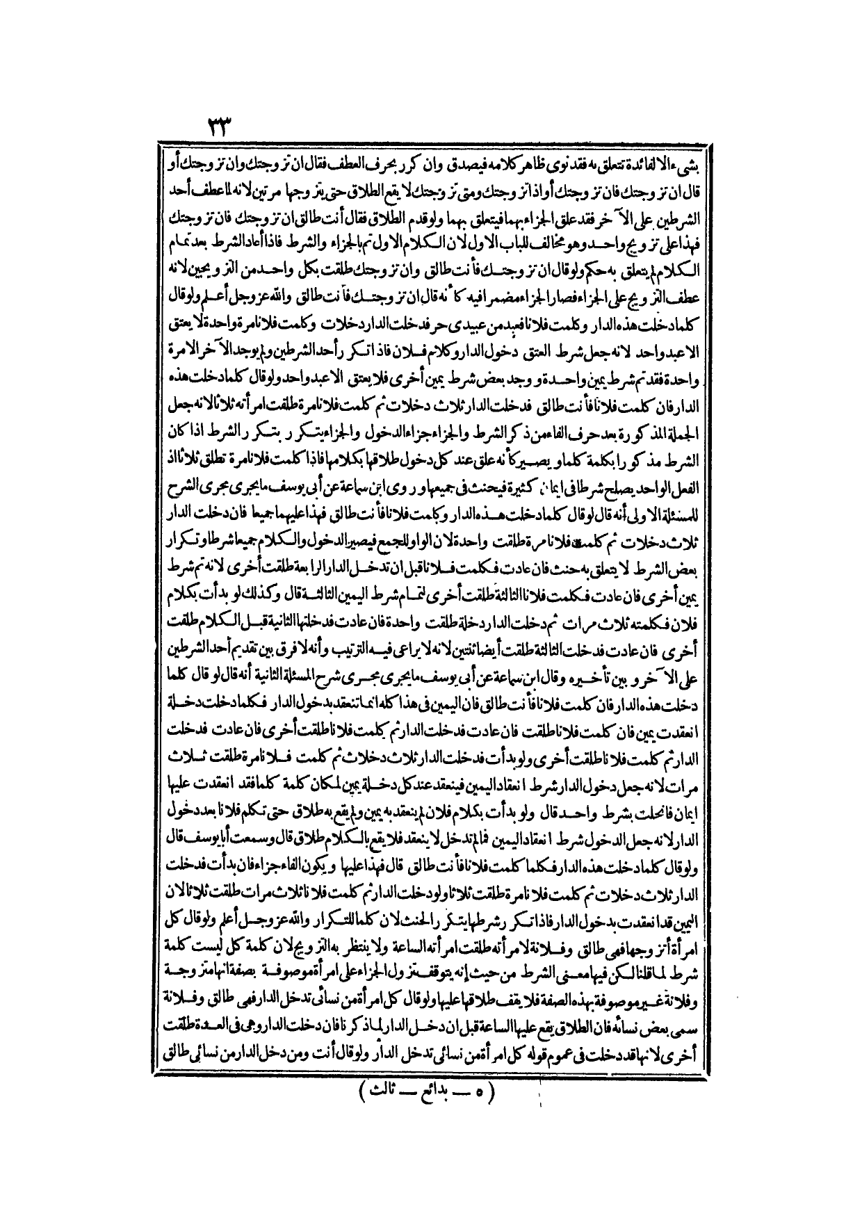 وَقَالَ ابْنُ سِمَاعَةَ عَنْ أَبِي يُوسُفَ مَا يَجْرِي مَجْرَى شَرْحِ الْمَسْأَلَةِ الثَّانِيَةِ أَنَّهُ قَالَ لَوْ قَالَ كُلَّمَا دَخَلْت هَذِهِ الدَّارَ فَإِنْ كَلَّمْت فُلَانًا فَأَنْتِ طَالِقٌ فَإِنَّ الْيَمِينَ فِي هَذَا كُلِّهِ إنَّمَا تَنْعَقِدُ بِدُخُولِ الدَّارِ فَكُلَّمَا دَخَلَتْ دَخْلَةً انْعَقَدَتْ يَمِينٌ فَإِنْ كَلَّمَتْ فُلَانًا طَلُقَتْ فَإِنْ عَادَتْ فَدَخَلَتْ الدَّارَ ثُمَّ كَلَّمَتْ فُلَانًا طَلُقَتْ أُخْرَى فَإِنْ عَادَتْ فَدَخَلَتْ الدَّارَ ثُمَّ كَلَّمَتْ فُلَانًا طَلُقَتْ أُخْرَى وَلَوْ بَدَأَتْ فَدَخَلَتْ الدَّارَ ثَلَاثً دَخَلَاتٍ ثُمَّ كَلَّمَتْ فُلَانًا مَرَّةً طَلُقَتْ ثَلَاثً مَرَّاتٍ؛ لِأَنَّهُ جَعَلَ دُخُولَ الدَّارِ شَرْطَ انْعِقَادِ الْيَمِينِ فَيَنْعَقِدُ عِنْدَ كُلِّ دَخْلَةٍ يَمِينٌ لِمَكَانِ كَلِمَةِ كُلَّمَا فَقَدْ انْعَقَدَتْ عَلَيْهَا أَيْمَانٌ فَانْحَلَّتْ بِشَرْطٍ وَاحِدٍ.