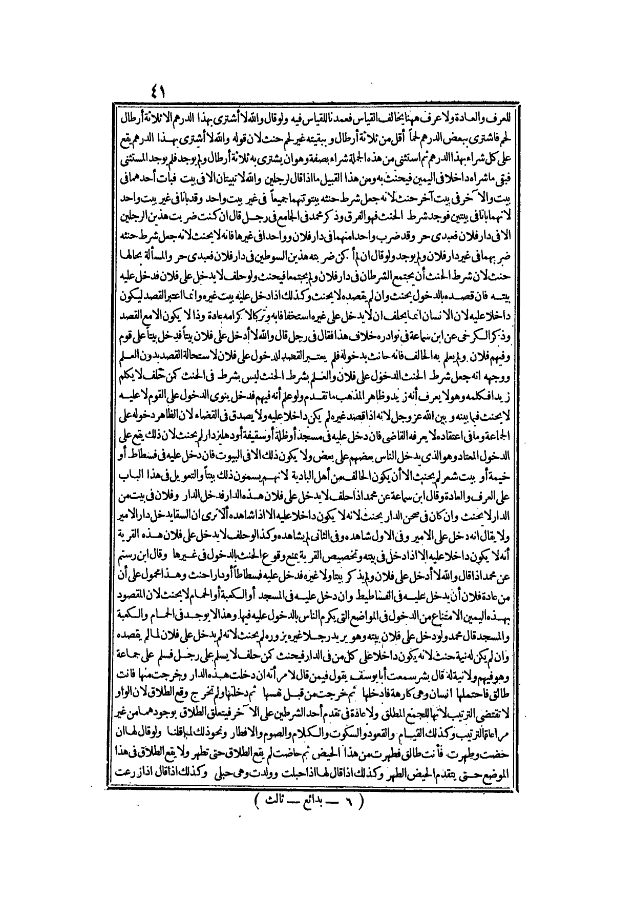 لِلْعُرْفِ وَالْعَادَةِ وَلَا عُرْفَ هَهُنَا يُخَالِفُ الْقِيَاسَ فَعَمَدْنَا لِلْقِيَاسِ فِيهِ، وَلَوْ قَالَ: وَاَللَّهِ لَا أَشْتَرِي بِهَذَا الدِّرْهَمِ إلَّا ثَلَاثَةَ أَرْطَالِ لَحْمٍ فَاشْتَرَى بِبَعْضِ الدِّرْهَمِ لَحْمًا أَقَلَّ مِنْ ثَلَاثَةِ أَرْطَالٍ وَبِبَقِيَّتِهِ غَيْرَ لَحْمٍ حَنِثَ؛ لِأَنَّ قَوْلَهُ وَاَللَّهِ لَا أَشْتَرِي بِهَذَا الدِّرْهَمِ يَقَعُ عَلَى كُلِّ شِرَاءٍ بِهَذَا الدِّرْهَمِ ثُمَّ اسْتَثْنَى مِنْ هَذِهِ الْجُمْلَةِ شِرَاءً بِصِفَةٍ وَهُوَ أَنْ يَشْتَرِيَ بِهِ ثَلَاثَةَ أَرْطَالٍ وَلَمْ يُوجَدْ فَلَمْ يُوجَدْ الْمُسْتَثْنَى فَبَقِيَ مَا شَرَاهُ دَاخِلًا فِي الْيَمِينِ فَيَحْنَثُ بِهِ، وَمِنْ هَذَا الْقَبِيلِ مَا إذَا قَالَ لِرَجُلَيْنِ: وَاَللَّهِ لَا تَبِيتَانِ إلَّا فِي بَيْتٍ فَبَاتَ أَحَدُهُمَا فِي بَيْتٍ وَالْآخَرُ فِي بَيْتٍ آخَرَ حَنِثَ لِأَنَّهُ جَعَلَ شَرْطَ حِنْثِهِ بَيْتُوتَتَهُمَا جَمِيعًا فِي غَيْرِ بَيْتٍ وَاحِدٍ وَقَدْ بَاتَا فِي غَيْرِ بَيْتٍ وَاحِدٍ لِأَنَّهُمَا بَاتَا فِي بَيْتَيْنِ فَوُجِدَ شَرْطُ الْحِنْثِ فَهُوَ الْفَرْقُ.