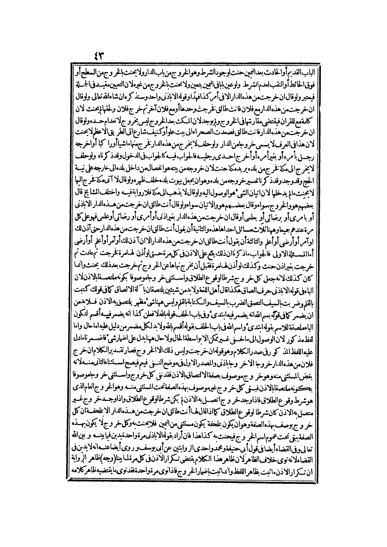 الْبَابِ الْقَدِيمِ أَوْ الْحَادِثِ بَعْدَ الْيَمِينِ حَنِثَ لِوُجُودِ الشَّرْطِ وَهُوَ الْخُرُوجُ مِنْ بَابِ الدَّارِ، وَلَا يَحْنَثُ بِالْخُرُوجِ مِنْ السَّطْحِ أَوْ فَوْقِ الْحَائِطِ أَوْ النَّقْبِ لِعَدَمِ الشَّرْطِ، وَلَوْ عَيَّنَ بَابًا فِي الْيَمِينِ يَتَعَيَّنُ، وَلَا يَحْنَثُ بِالْخُرُوجِ مِنْ غَيْرِهِ؛ لِأَنَّ التَّعْيِينَ مُقَيِّدٌ فِي الْجُمْلَةِ فَيُعْتَبَرُ، وَلَوْ قَالَ إنْ خَرَجْت مِنْ هَذِهِ الدَّارِ إلَّا فِي أَمْرِ كَذَا فَهَذَا، وَقَوْلُهُ إلَّا بِإِذْنِي وَاحِدٌ، وَسَنَذْكُرُهُ إنْ شَاءَ اللَّهُ تَعَالَى وَلَوْ قَالَ إنْ خَرَجْتِ مِنْ هَذِهِ الدَّارِ مَعَ فُلَانٍ فَأَنْتِ طَالِقٌ فَخَرَجَتْ وَحْدَهَا أَوْ مَعَ فُلَانٍ آخَرَ ثُمَّ خَرَجَ فُلَانٌ وَلَحِقَهَا لَمْ يَحْنَثْ؛ لِأَنَّ كَلِمَةَ مَعَ لِلْقِرَانِ فَيَقْتَضِي مُقَارَنَتَهَا فِي الْخُرُوجِ وَلَمْ يُوجَدْ لِأَنَّ الْمُكْثَ بَعْدَ الْخُرُوجِ لَيْسَ بِخُرُوجٍ لِانْعِدَامِ حَدِّهِ، وَلَوْ قَالَ إنْ خَرَجْتِ مِنْ هَذِهِ الدَّارِ فَأَنْتِ طَالِقٌ فَصَعِدَتْ الصَّحْرَاءَ إلَى بَيْتِ عُلُوٍّ أَوْ كَنِيفٍ شَارِعٍ إلَى الطَّرِيقِ الْأَعْظَمِ لَا يَحْنَثُ؛ لِأَنَّ هَذَا فِي الْعُرْفِ لَا يُسَمَّى خُرُوجًا مِنْ الدَّارِ، وَلَوْ حَلَفَ لَا يَخْرُجُ مِنْ هَذِهِ الدَّارِ فَخَرَجَ مِنْهَا مَاشِيًا أَوْ رَاكِبًا أَوْ أَخْرَجَهُ رَجُلٌ بِأَمْرِهِ أَوْ بِغَيْرِ أَمْرِهِ أَوْ أَخْرَجَ إحْدَى رِجْلَيْهِ فَالْجَوَابُ فِيهِ كَالْجَوَابِ فِي الدُّخُولِ وَقَدْ ذَكَرْنَاهُ، وَلَوْ حَلَفَ لَا يَخْرُجُ إلَى مَكَّةَ فَخَرَجَ مِنْ بَلَدِهِ يُرِيدُ مَكَّةَ حَنِثَ؛ لِأَنَّ خُرُوجَهُ مِنْ بَيْتِهِ هُوَ انْفِصَالٌ مِنْ دَاخِلِ بَلَدِهِ إلَى خَارِجِهِ عَلَى نِيَّةِ الْحَجِّ وَقَدْ وُجِدَ، وَقَدْ ذَكَرْنَا تَفْسِيرَ خُرُوجِهِ مِنْ بَلَدِهِ وَهُوَ أَنْ يَجْعَلَ بُيُوتَ بَلَدِهِ خَلْفَ ظَهْرِهِ، وَلَوْ قَالَ لَا آتِي مَكَّةَ فَخَرَجَ إلَيْهَا لَا يَحْنَثُ مَا لَمْ يَدْخُلْهَا؛ لِأَنَّ إتْيَانَ الشَّيْءِ هُوَ الْوُصُولُ إلَيْهِ، وَلَوْ قَالَ: لَا يَذْهَبُ إلَى مَكَّةَ فَلَا رِوَايَةَ فِيهِ، وَاخْتَلَفَ الْمَشَايِخُ: قَالَ بَعْضُهُمْ: هُوَ وَالْخُرُوجُ سَوَاءٌ وَقَالَ بَعْضُهُمْ: هُوَ وَالْإِتْيَانُ سَوَاءٌ،.