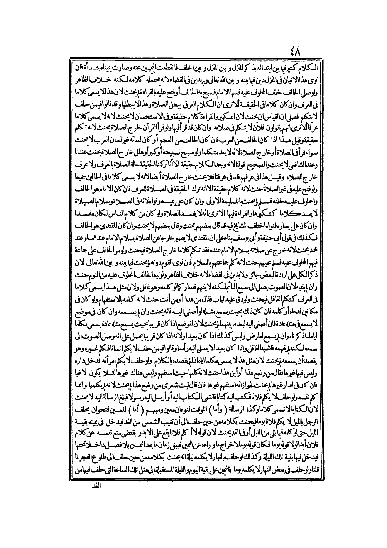 أَلَا تَرَى أَنَّهُمْ يَقُولُونَ فُلَانٌ لَا يَتَكَلَّمُ فِي صَلَاتِهِ وَإِنْ كَانَ قَدْ قَرَأَ فِيهَا، وَلَوْ قَرَأَ الْقُرْآنَ خَارِجَ الصَّلَاةِ يَحْنَثُ؛ لِأَنَّهُ تَكَلَّمَ حَقِيقَةً،.