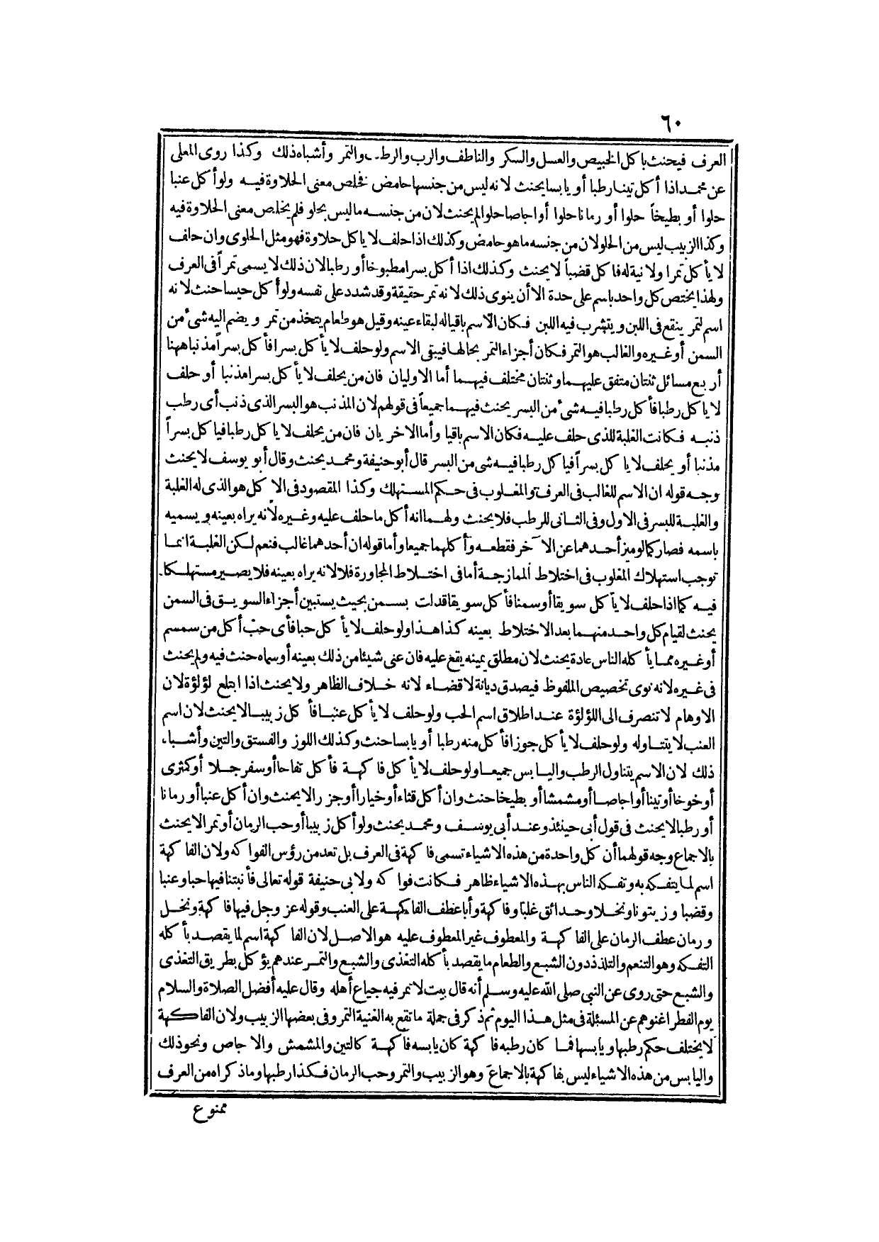 الْعُرْفِ فَيَحْنَثُ بِأَكَلِ الْخَبِيصِ وَالْعَسَلِ وَالسُّكَّرِ وَالنَّاطِفِ وَالرَّبِّ وَالرُّطَبِ وَالتَّمْرِ وَأَشْبَاهِ ذَلِكَ.