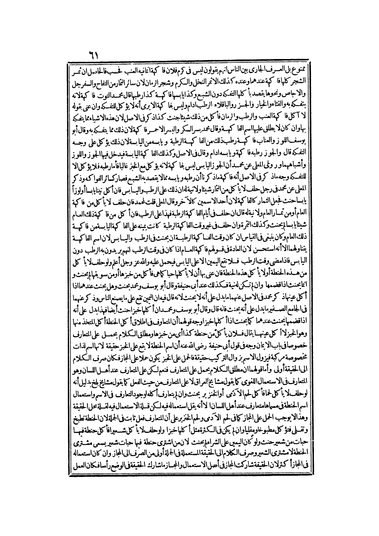 مَمْنُوعٌ بَلْ الْعُرْفُ الْجَارِي بَيْنَ النَّاسِ أَنَّهُمْ يَقُولُونَ لَيْسَ فِي كَرْمِ فُلَانٍ فَاكِهَةٌ إنَّمَا فِيهِ الْعِنَبُ فَحَسْبُ فَالْحَاصِلُ أَنَّ ثَمَرَ الشَّجَرِ كُلِّهَا فَاكِهَةُ عِنْدَهُمَا وَعِنْدَهُ كَذَلِكَ إلَّا ثَمَرَ النَّخْلِ وَالْكَرْمِ وَشَجَرِ الرُّمَّانِ لِأَنَّ سَائِرَ الثِّمَارِ مِنْ التُّفَّاحِ وَالسَّفَرْجَلِ وَالْإِجَّاصِ وَنَحْوِهَا يُقْصَدُ بِأَكْلِهَا التَّفَكُّهُ دُونَ الشِّبَعِ وَكَذَا يَابِسُهَا فَاكِهَةٌ كَذَا رَطْبُهَا قَالَ مُحَمَّدٌ التُّوتُ فَاكِهَةٌ لِأَنَّهُ يُتَفَكَّهُ بِهِ وَالْقِثَّاءُ وَالْخِيَارُ وَالْجَزَرُ وَالْبَاقِلَّاءُ الرَّطْبُ إدَامٌ وَلَيْسَ بِفَاكِهَةٍ أَلَا تَرَى أَنَّهُ لَا يُؤْكَلُ لِلتَّفَكُّهِ وَإِنْ عَنَى بِقَوْلِهِ لَا آكُلُ فَاكِهَةً الْعِنَبَ وَالرُّطَبَ وَالرُّمَّانَ فَأَكَلَ مِنْ ذَلِكَ شَيْئًا حَنِثَ كَذَا ذَكَرَ فِي الْأَصْلِ لِأَنَّ هَذِهِ الْأَشْيَاءَ مِمَّا يُتَفَكَّهُ بِهَا وَإِنْ كَانَ لَا يُطْلَقُ عَلَيْهَا اسْمُ الْفَاكِهَةِ.