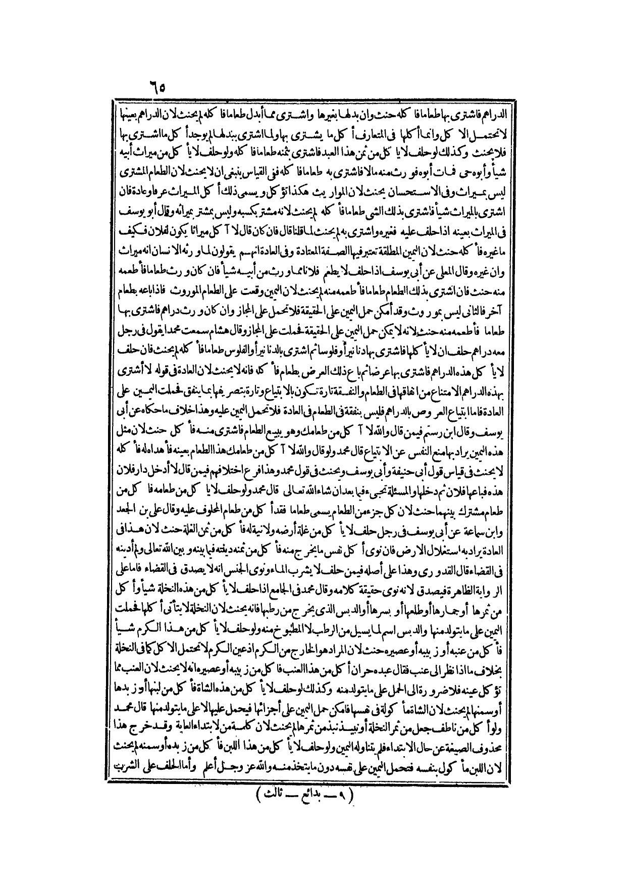 ابْنُ رُسْتُمَ فِيمَنْ قَالَ وَاَللَّهِ لَا آكُلُ مِنْ طَعَامِك وَهُوَ يَبِيعُ الطَّعَامَ فَاشْتَرَى مِنْهُ فَأَكَلَ حَنِثَ لِأَنَّ مِثْلَ هَذِهِ الْيَمِينِ يُرَادُ بِهَا مَنْعُ النَّفْسِ عَنْ الِابْتِيَاعِ قَالَ مُحَمَّدٌ.