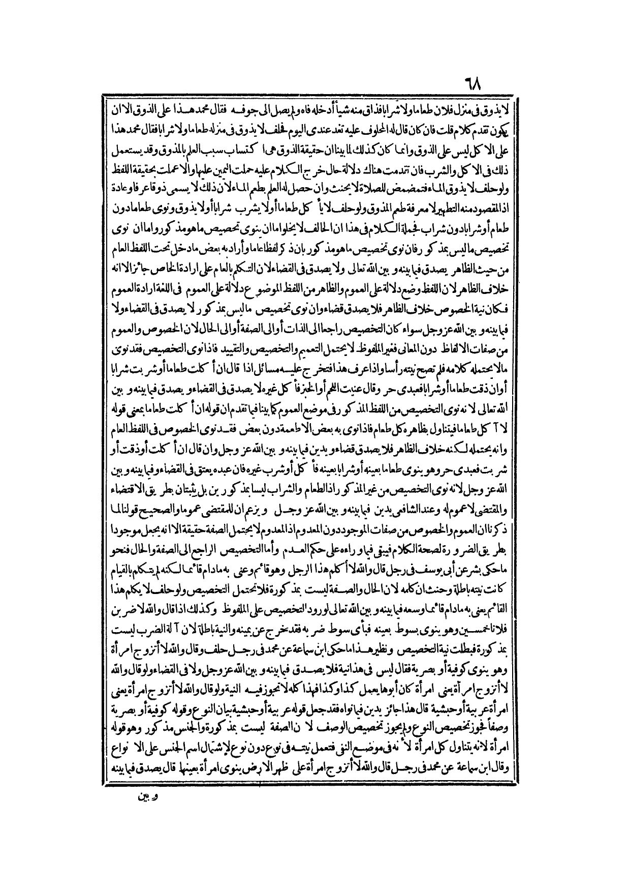 فَجُمْلَةُ الْكَلَامِ فِي هَذَا أَنَّ الْحَالِفَ لَا يَخْلُو إمَّا أَنْ يَنْوِيَ تَحْصِيص مَا هُوَ مَذْكُورٌ وَإِمَّا أَنْ نَوَى تَخْصِيصَ مَا لَيْسَ بِمَذْكُورٍ فَإِنْ نَوَى تَخْصِيصَ مَا هُوَ مَذْكُورٌ بِأَنْ ذَكَرَ لَفْظًا عَامًّا وَأَرَادَ بِهِ بَعْضَ مَا دَخَلَ تَحْتَ اللَّفْظِ الْعَامِّ مِنْ حَيْثُ الظَّاهِرُ يُصَدَّقُ فِيمَا بَيْنَهُ وَبَيْنَ اللَّهِ تَعَالَى وَلَا يُصَدَّقُ فِي الْقَضَاءِ لِأَنَّ التَّكَلُّمَ بِالْعَامِّ عَلَى إرَادَةِ الْخَاصِّ جَائِزٌ إلَّا أَنَّهُ خِلَافُ الظَّاهِرِ لِأَنَّ اللَّفْظَ وُضِعَ دَلَالَةً عَلَى الْعُمُومِ وَالظَّاهِرُ مِنْ اللَّفْظِ الْمَوْضُوعِ دَلَالَةً عَلَى الْعُمُومِ فِي اللُّغَةِ إرَادَةُ الْعُمُومِ فَكَانَ نِيَّةُ الْخُصُوصِ خِلَافَ الظَّاهِرِ فَلَا يُصَدَّقُ قَضَاءً وَإِنْ نَوَى تَخْصِيصَ مَا لَيْسَ بِمَذْكُورٍ لَا يُصَدَّقْ فِي الْقَضَاءِ وَلَا فِيمَا بَيْنَهُ وَبَيْنَ اللَّهِ عَزَّ وَجَلَّ سَوَاءٌ كَانَ التَّخْصِيصُ رَاجِعًا إلَى الذَّاتِ أَوْ إلَى الصِّفَةِ أَوْ إلَى الْحَالِ لِأَنَّ الْخُصُوصَ وَالْعُمُومَ مِنْ صِفَاتِ الْأَلْفَاظِ دُونَ الْمَعَانِي فَغَيْرُ الْمَلْفُوظِ لَا يَحْتَمِلُ التَّعْمِيمَ وَالتَّخْصِيصَ وَالتَّقْيِيدَ فَإِذَا نَوَى التَّخْصِيصَ فَقَدْ نَوَى مَا لَا يَحْتَمِلُهُ كَلَامُهُ فَلَمْ تَصِحَّ نِيَّتُهُ رَأْسًا وَإِذَا عُرِفَ هَذَا فَتُخَرَّجُ عَلَيْهِ مَسَائِلُ إذَا قَالَ إنْ أَكَلْت طَعَامًا أَوْ شَرِبْت شَرَابًا أَوْ إنْ ذُقْت طَعَامًا أَوْ شَرَابًا فَعَبْدِي حُرٌّ، وَقَالَ عَنَيْت اللَّحْمَ أَوْ الْخُبْزَ فَأَكَلَ غَيْرَهُ لَا يُصَدَّقُ فِي الْقَضَاءِ وَيُصَدَّقُ فِيمَا بَيْنَهُ وَبَيْنَ اللَّهِ تَعَالَى لِأَنَّهُ نَوَى التَّخْصِيصَ مِنْ اللَّفْظِ الْمَذْكُورِ فِي مَوْضِعِ الْعُمُومِ كَمَا بَيَّنَّا فِيمَا تَقَدَّمَ أَنَّ قَوْلَهُ إنْ أَكَلْت طَعَامًا بِمَعْنَى قَوْلِهِ لَا آكُلُ طَعَامًا فَيَتَنَاوَلُ بِظَاهِرِهِ كُلَّ طَعَامٍ فَإِذَا نَوَى بِهِ بَعْضَ الْأَطْعِمَةِ دُونَ بَعْضٍ فَقَدْ نَوَى الْخُصُوصَ فِي اللَّفْظِ الْعَامِّ وَأَنَّهُ يَحْتَمِلُهُ لَكِنَّهُ خِلَافُ الظَّاهِرِ فَلَا يُصَدَّقُ قَضَاءً وَيَدِينُ فِيمَا بَيْنَهُ وَبَيْنَ اللَّهِ عَزَّ وَجَلَّ وَإِنْ قَالَ إنْ أَكَلْت أَوْ ذُقْت أَوْ شَرِبْت فَعَبْدِي حُرٌّ وَهُوَ يَنْوِي طَعَامًا بِعَيْنِهِ أَوْ شَرَابًا بِعَيْنِهِ فَأَكَلَ أَوْ شَرِبَ غَيْرَهُ فَإِنَّ عَبْدَهُ يَعْتِقُ فِي الْقَضَاءِ وَفِيمَا بَيْنَهُ وَبَيْنَ اللَّهِ عَزَّ وَجَلَّ لِأَنَّهُ نَوَى التَّخْصِيصَ مِنْ غَيْرِ الْمَذْكُورِ إذْ الطَّعَامُ وَالشَّرَابُ لَيْسَا بِمَذْكُورَيْنِ بَلْ يَثْبُتَانِ بِطَرِيقِ الِاقْتِضَاءِ وَالْمُقْتَضَى لَا عُمُومَ لَهُ وَعِنْدَ الشَّافِعِيِّ يَدِينُ فِيمَا بَيْنَهُ وَبَيْنَ اللَّهِ عَزَّ وَجَلَّ وَيَزْعُمُ أَنَّ لِلْمُقْتَضَى عُمُومًا وَالصَّحِيحُ قَوْلُنَا لِمَا ذَكَرْنَا أَنَّ الْعُمُومَ وَالْخُصُوصَ مِنْ صِفَاتِ الْمَوْجُودِ دُونَ الْمَعْدُومِ إذْ الْمَعْدُومُ لَا يَحْتَمِلُ الصِّفَةَ حَقِيقَةً إلَّا أَنَّهُ يُجْعَلُ مَوْجُودًا بِطَرِيقِ الضَّرُورَةِ لِصِحَّةِ الْكَلَامِ فَيُبْقِي فِيمَا وَرَاءَهُ عَلَى حُكْمِ الْعَدَمِ وَأَمَّا التَّخْصِيصُ الرَّاجِعُ إلَى الصِّفَةِ وَالْحَالِ فَنَحْوُ مَا حَكَى بِشْرٌ عَنْ أَبِي يُوسُفَ فِي رَجُلٍ قَالَ وَاَللَّهِ لَا أُكَلِّمُ هَذَا الرَّجُلَ وَهُوَ قَائِمٌ وَعَنَى بِهِ وَمَا دَامَ قَائِمًا لَكِنَّهُ لَمْ يَتَكَلَّمْ بِالْقِيَامِ كَانَتْ نِيَّتُهُ بَاطِلَةً وَحَنِثَ إنْ كَلَّمَهُ لِأَنَّ الْحَالَ وَالصِّفَةَ لَيْسَتْ بِمَذْكُورَةٍ فَلَا تَحْتَمِلُ التَّخْصِيصَ.