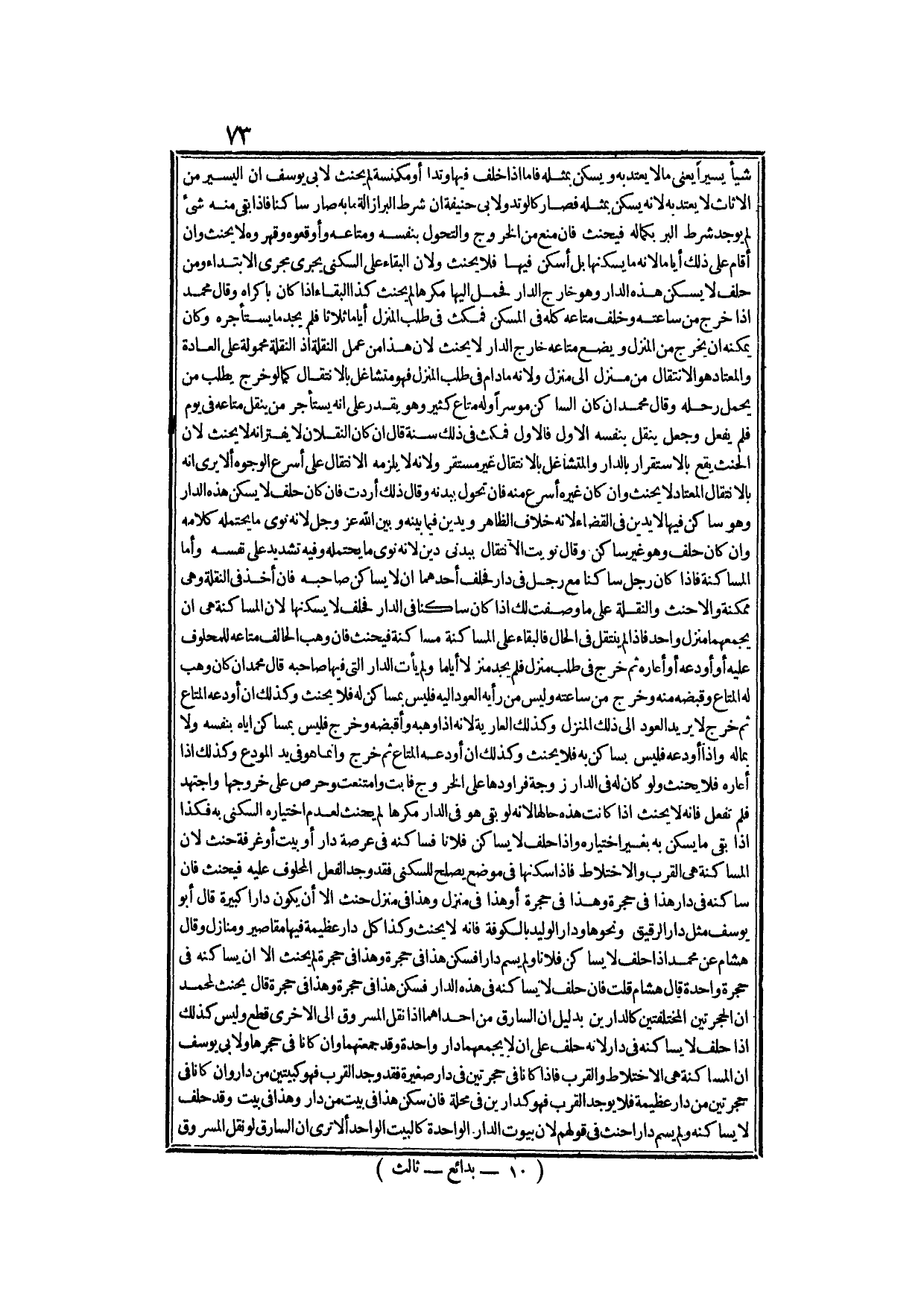 وَقَالَ نَوَيْت الِانْتِقَالَ بِبَدَنِي دِينَ لِأَنَّهُ نَوَى مَا يَحْتَمِلُهُ وَفِيهِ تَشْدِيدٌ عَلَى نَفْسِهِ وَأَمَّا الْمُسَاكَنَةُ فَإِذَا كَانَ رَجُلٌ سَاكِنًا مَعَ رَجُلٍ فِي دَارٍ فَحَلَفَ أَحَدُهُمَا أَنْ لَا يُسَاكِنَ صَاحِبَهُ فَإِنْ أَخَذَ فِي النُّقْلَةِ وَهِيَ مُمْكِنَةٌ وَإِلَّا حَنِثَ وَالنُّقْلَةُ عَلَى مَا وَصَفْت لَك إذَا كَانَ سَاكِنًا فِي الدَّارِ فَحَلَفَ لَا يَسْكُنُهَا لِأَنَّ الْمُسَاكَنَةَ هِيَ أَنْ يَجْمَعَهُمَا مَنْزِلٌ وَاحِدٌ فَإِذَا لَمْ يَنْتَقِلْ فِي الْحَالِ فَالْبَقَاءُ عَلَى الْمُسَاكَنَةِ مُسَاكَنَةٌ فَيَحْنَثُ فَإِنْ وَهَبَ الْحَالِفُ مَتَاعَهُ لِلْمَحْلُوفِ عَلَيْهِ أَوْ أَوْدَعَهُ أَوْ أَعَارَهُ ثُمَّ خَرَجَ فِي طَلَبِ مَنْزِلٍ فَلَمْ يَجِدْ مَنْزِلًا أَيَّامًا وَلَمْ يَأْتِ الدَّارَ الَّتِي فِيهَا صَاحِبُهُ قَالَ مُحَمَّدٌ إنْ كَانَ وَهَبَ لَهُ الْمَتَاعَ وَقَبَضَهُ مِنْهُ وَخَرَجَ مِنْ سَاعَتِهِ وَلَيْسَ مِنْ رَأْيِهِ الْعَوْدُ إلَيْهِ فَلَيْسَ بِمُسَاكِنٍ لَهُ فَلَا يَحْنَثُ وَكَذَلِكَ إنْ أَوْدَعَهُ الْمَتَاعَ ثُمَّ خَرَجَ لَا يُرِيدُ الْعَوْدَ إلَى ذَلِكَ الْمَنْزِلِ وَكَذَلِكَ الْعَارِيَّةُ لِأَنَّهُ إذَا وَهَبَهُ وَأَقْبَضَهُ وَخَرَجَ فَلَيْسَ بِمُسَاكِنٍ إيَّاهُ بِنَفْسِهِ وَلَا بِمَالِهِ وَإِذَا أَوْدَعَهُ فَلَيْسَ بِسَاكِنٍ بِهِ فَلَا يَحْنَثُ وَكَذَلِكَ إنْ أَوْدَعَهُ الْمَتَاعَ ثُمَّ خَرَجَ وَإِنَّمَا هُوَ فِي يَدِ الْمُودَعِ وَكَذَلِكَ إذَا أَعَارَهُ فَلَا يَحْنَثُ وَلَوْ كَانَ لَهُ فِي الدَّارِ زَوْجَةٌ فَرَاوَدَهَا عَلَى الْخُرُوجِ فَأَبَتْ وَامْتَنَعَتْ وَحَرَصَ عَلَى خُرُوجِهَا وَاجْتَهَدَ فَلَمْ تَفْعَلْ فَإِنَّهُ لَا يَحْنَثُ إذَا كَانَتْ هَذِهِ حَالَهَا لِأَنَّهُ لَوْ بَقِيَ هُوَ فِي الدَّارِ مُكْرَهًا لَمْ يَحْنَثْ لِعَدَمِ اخْتِيَاره السُّكْنَى بِهِ فَكَذَا إذَا بَقِيَ مَا يُسْكَنُ بِهِ بِغَيْرِ اخْتِيَاره وَإِذَا حَلَفَ لَا يُسَاكِنُ فُلَانًا فَسَاكَنَهُ فِي عَرْصَةِ دَارٍ أَوْ بَيْتٍ أَوْ غُرْفَةٍ حَنِثَ لِأَنَّ الْمُسَاكَنَةَ هِيَ الْقُرَبُ وَالِاخْتِلَاطُ فَإِذَا سَكَنَهَا فِي مَوْضِعٍ يَصْلُحُ لِلسُّكْنَى فَقَدْ وُجِدَ الْفِعْلُ الْمَحْلُوفُ عَلَيْهِ فَيَحْنَثُ فَإِنْ سَاكَنَهُ فِي دَارٍ هَذَا فِي حُجْرَةٍ وَهَذَا فِي حُجْرَةٍ أَوْ هَذَا فِي مَنْزِلٍ وَهَذَا فِي مَنْزِلٍ حَنِثَ إلَّا أَنْ يَكُونَ دَارًا كَبِيرَةً قَالَ أَبُو يُوسُفَ مِثْلُ دَارِ الرَّقِيقِ وَنَحْوِهَا وَدَارِ الْوَلِيدِ بِالْكُوفَةِ فَإِنَّهُ لَا يَحْنَثُ وَكَذَا كُلُّ دَارٍ عَظِيمَةٍ فِيهَا مَقَاصِيرُ وَمَنَازِلُ.