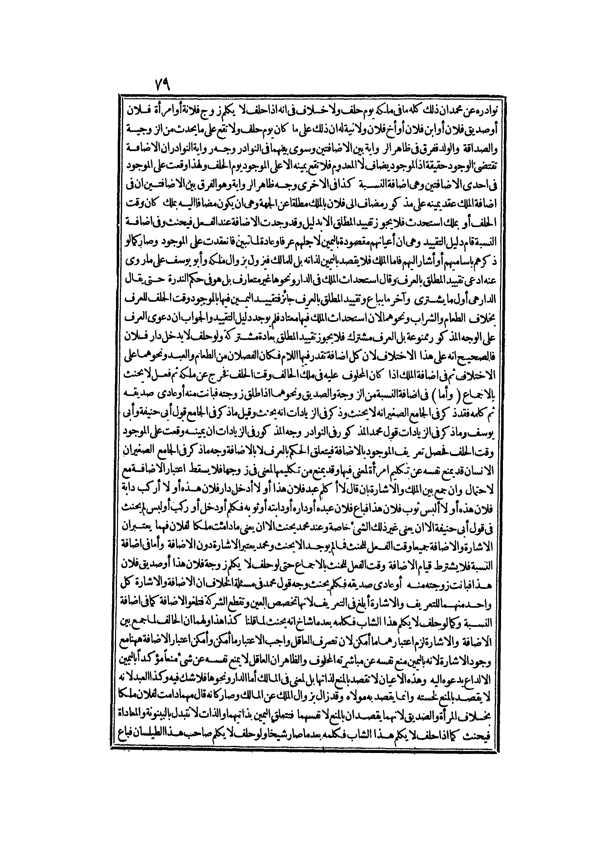 عَنْ مُحَمَّدٍ أَنَّ ذَلِكَ كُلَّهُ مَا فِي مِلْكِهِ يَوْمَ حَلَفَ وَلَا خِلَافَ فِي أَنَّهُ إذَا حَلَفَ لَا يُكَلِّمُ زَوْجَ فُلَانَةَ أَوْ امْرَأَةَ فُلَانٍ أَوْ صَدِيقَ فُلَانٍ أَوْ ابْنَ فُلَانٍ أَوْ أَخ فُلَانٍ وَلَا نِيَّةَ لَهُ أَنَّ ذَلِكَ عَلَى مَا كَانَ يَوْمَ حَلَفَ وَلَا تَقَعُ عَلَى مَا يَحْدُثُ مِنْ الزَّوْجِيَّةِ وَالصَّدَاقَةِ وَالْوَلَدِ فَفَرَّقَ فِي ظَاهِرِ الرِّوَايَةِ بَيْنَ الْإِضَافَتَيْنِ وَسَوَّى بَيْنَهُمَا فِي النَّوَادِرِ وَجْهُ رِوَايَةِ النَّوَادِرِ أَنَّ الْإِضَافَةَ تَقْتَضِي الْوُجُودَ حَقِيقَةً إذْ الْمَوْجُودُ يُضَافُ لَا الْمَعْدُومُ فَلَا تَقَعُ يَمِينُهُ إلَّا عَلَى الْمَوْجُودِ يَوْمَ الْحَلِفِ وَلِهَذَا وَقَعَتْ عَلَى الْمَوْجُودِ فِي إحْدَى الْإِضَافَتَيْنِ وَهِيَ إضَافَةُ النِّسْبَةِ كَذَا فِي الْأُخْرَى وَجْهُ ظَاهِرِ الرِّوَايَةِ وَهُوَ الْفَرْقُ بَيْنَ الْإِضَافَتَيْنِ أَنَّ فِي إضَافَةِ الْمِلْكِ عَقَدَ يَمِينَهُ عَلَى مَذْكُورٍ مُضَافٍ إلَى فُلَانٍ بِالْمِلْكِ مُطْلَقًا عَنْ الْجِهَةِ وَهِيَ أَنْ يَكُونَ مُضَافًا إلَيْهِ بِمِلْكٍ كَانَ وَقْتَ الْحَلِفِ أَوْ بِمِلْكٍ اُسْتُحْدِثَ فَلَا يَجُوزُ تَقْيِيدُ الْمُطْلَقِ إلَّا بِدَلِيلٍ وَقَدْ وُجِدَتْ الْإِضَافَةُ عِنْدَ الْفِعْلِ فَيَحْنَثُ وَفِي إضَافَةِ النِّسْبَةِ قَامَ دَلِيلُ التَّقْيِيدِ وَهِيَ أَنَّ أَعْيَانَهُمْ مَقْصُودَةٌ بِالْيَمِينِ لِأَجْلِهِمْ عُرْفًا وَعَادَةً لِمَا تَبَيَّنَ فَانْعَقَدَتْ عَلَى الْوُجُودِ وَصَارَ كَمَا لَوْ ذَكَرَهُمْ بِأَسَامِيهِمْ أَوْ أَشَارَ إلَيْهِمْ فَأَمَّا الْمِلْكُ فَلَا يُقْصَدُ بِالْيَمِينِ لِذَاتِهِ بَلْ لِمَالِكٍ فَيَزُولُ بِزَوَالِ مِلْكِهِ وَأَبُو يُوسُفَ عَلَى مَا رُوِيَ عَنْهُ ادَّعَى تَقْيِيدَ الْمُطْلَقِ بِالْعُرْفِ.