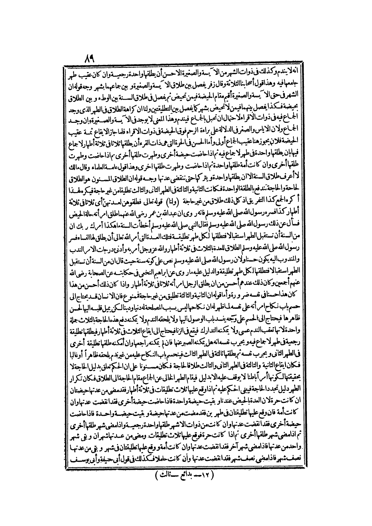 وَأَمَّا قَوْلُهُ إنَّ الثَّانِيَةَ وَالثَّالِثَةَ تَطْلِيقٌ مِنْ غَيْرِ حَاجَةٍ فَمَمْنُوعٌ، فَإِنَّ الْإِنْسَانَ قَدْ يَحْتَاجُ إلَى حَسْمِ بَابِ نِكَاحِ امْرَأَتِهِ عَلَى نَفْسِهِ لِمَا ظَهَرَ لَهُ أَنَّ نِكَاحَهَا لَيْسَ بِسَبَبِ الْمَصْلَحَةِ لَهُ دُنْيَا وَدِينًا لَكِنْ يَمِيلُ قَلْبُهُ إلَيْهَا لِحُسْنِ ظَاهِرِهَا فَيَحْتَاجُ إلَى الْحَسْمِ عَلَى وَجْهٍ يَنْسَدُّ بَابُ الْوُصُولِ إلَيْهَا وَلَا يَلْحَقُهُ النَّدَمُ غَلَا يُمْكِنُهُ دَفْعُ هَذِهِ الْحَاجَةِ بِالثَّلَاثِ جُمْلَةً وَاحِدَةً لِأَنَّهَا تُعَقِّبُ النَّدَمَ عَسَى وَلَا يُمْكِنُهُ التَّدَارُكُ فَيَقَعَ فِي الزِّنَا فَيَحْتَاجَ إلَى إيقَاعِ الثَّلَاثِ فِي ثَلَاثَةِ أَطْهَارٍ، فَيُطَلِّقَهَا تَطْلِيقَةً رَجْعِيَّةً فِي طُهْرٍ لَا جِمَاعَ فِيهِ وَيُجَرِّبُ نَفْسَهُ أَنَّهُ هَلْ يُمْكِنُهُ الصَّبْرُ عَنْهَا؟ فَإِنْ لَمْ يُمْكِنْهُ رَاجَعَهَا وَإِنْ أَمْكَنَهُ طَلَّقَهَا تَطْلِيقَةً أُخْرَى فِي الطُّهْرِ الثَّانِي وَيُجَرِّبُ نَفْسَهُ ثُمَّ يُطَلِّقُهَا ثَالِثَةً فِي الطُّهْرِ الثَّالِثِ فَيَنْحَسِمُ بَابُ النِّكَاحِ عَلَيْهِ مِنْ غَيْرِ نَدَمٍ يَلْحَقُهُ ظَاهِرًا أَوْ غَالِبًا، فَكَانَ إيقَاعُ الثَّانِيَةِ وَالثَّالِثَةِ فِي الطُّهْرِ الثَّانِي وَالثَّالِثِ طَلَاقًا لِحَاجَةٍ فَكَانَ مَسْنُونًا عَلَى أَنَّ الْحُكْمَ تَعَلَّقَ بِدَلِيلِ الْحَاجَةِ لَا بِحَقِيقَتِهَا لِكَوْنِهَا أَمْرًا بَاطِنًا لَا يُوقَفُ عَلَيْهِ إلَّا بِدَلِيلٍ فَيُقَامُ الطُّهْرُ الْخَالِي عَنْ الْجِمَاعِ مَقَامَ الْحَاجَةِ إلَى الطَّلَاقِ فَكَانَ تَكْرَارُ الطُّهْرِ دَلِيلَ تَجَدُّدِ الْحَاجَةِ فَيُبْنَى الْحُكْمُ عَلَيْهِ، ثُمَّ إذَا وَقَعَ عَلَيْهَا ثَلَاثُ تَطْلِيقَاتٍ فِي ثَلَاثَةِ أَطْهَارٍ فَقَدْ مَضَى مِنْ عِدَّتِهَا حَيْضَتَانِ إنْ كَانَتْ حُرَّةً لِأَنَّ الْعِدَّةَ بِالْحَيْضِ عِنْدَنَا، وَبَقِيَتْ حَيْضَةٌ وَاحِدَةٌ فَإِذَا حَاضَتْ حَيْضَةً أُخْرَى فَقَدْ انْقَضَتْ عِدَّتُهَا وَإِنْ كَانَتْ أَمَةً فَإِنْ وَقَعَ عَلَيْهَا تَطْلِيقَتَانِ فِي طُهْرَيْنِ فَقَدْ مَضَتْ مِنْ عِدَّتِهَا حَيْضَةٌ وَبَقِيَتْ حَيْضَةٌ وَاحِدَةٌ فَإِذَا حَاضَتْ حَيْضَةً أُخْرَى فَقَدْ انْقَضَتْ عِدَّتُهَا.