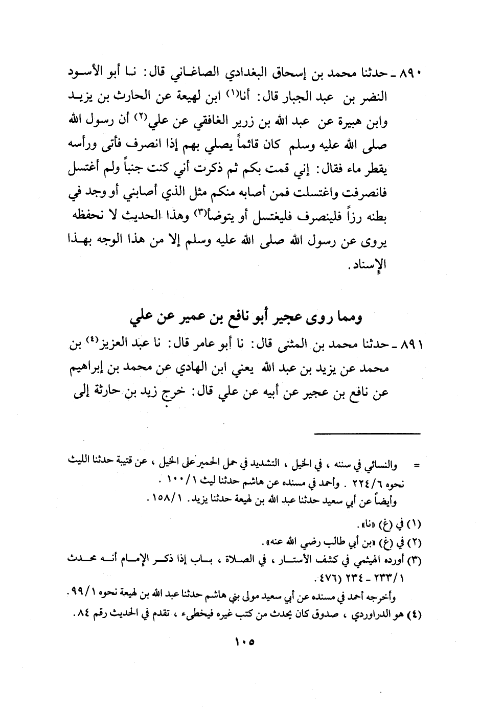 890 - حَدَّثَنَا مُحَمَّدُ بْنُ إِسْحَاقَ الْبَغْدَادِيُّ الصَّاغَانِيُّ، قَالَ: نا أَبُو الْأَسْوَدِ النَّضْرُ بْنُ عَبْدِ الْجَبَّارِ، قَالَ: أنا ابْنُ لَهِيعَةَ، عَنِ الْحَارِثِ بْنِ يَزِيدَ، وَابْنِ هُبَيْرَةَ، عَنْ عَبْدِ اللَّهِ بْنِ زُرَيْرٍ الْغَافِقِيِّ، عَنْ عَلِيٍّ، أَنَّ رَسُولَ اللَّهِ صَلَّى اللهُ عَلَيْهِ وَسَلَّمَ: كَانَ قَائِمًا يُصَلِّي بِهِمْ إِذَا انْصَرَفَ فَأَتَى وَرَأْسُهُ يَقْطُرُ مَاءً فَقَالَ: §إِنِّي قُمْتُ بِكُمْ ثُمَّ ذَكَرْتُ أَنِّي كُنْتُ جُنُبًا وَلَمْ أَغْتَسِلْ فَانْصَرَفْتُ، وَاغْتَسَلْتُ فَمَنْ أَصَابَهُ مِنْكُمْ مِثْلُ الَّذِي أَصَابَنِي أَوْ وَجَدَ فِي بَطْنِهِ رِزًّا فَلْيَنْصَرِفْ فَلْيَغْتَسِلْ أَوْ يَتَوَضَّأْ. وَهَذَا الْحَدِيثُ لَا نَحْفَظُهُ يُرْوَى عَنْ رَسُولِ اللَّهِ صَلَّى اللهُ عَلَيْهِ وَسَلَّمَ، إِلَّا مِنْ هَذَا الْوَجْهِ بِهَذَا الْإِسْنَادِ