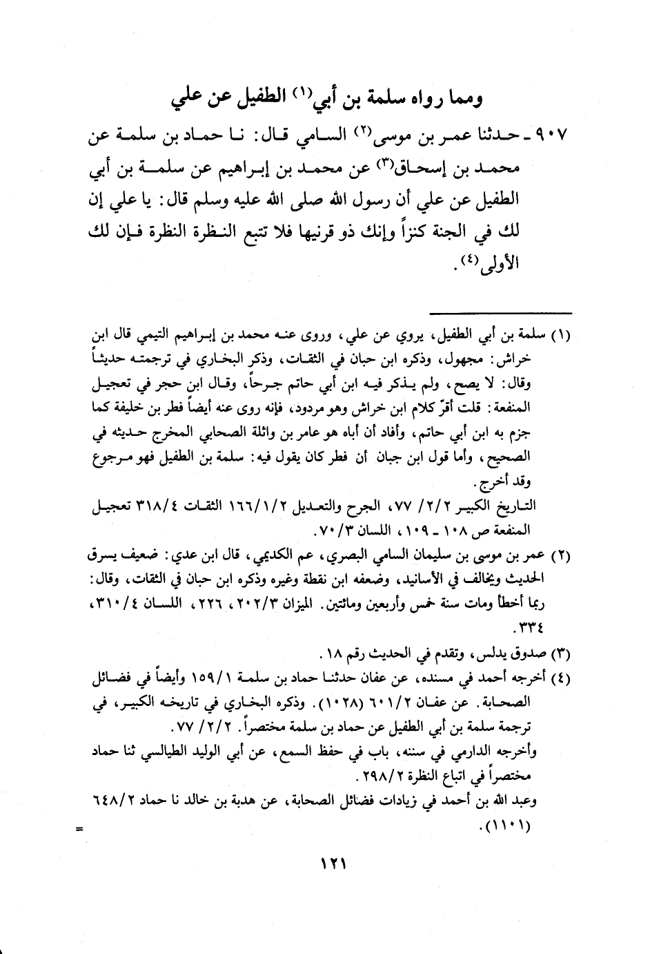 907 - حَدَّثَنَا عُمَرُ بْنُ مُوسَى السَّامِيُّ، قَالَ: نا حَمَّادُ بْنُ سَلَمَةَ، عَنْ مُحَمَّدِ بْنِ إِسْحَاقَ، عَنْ مُحَمَّدِ بْنِ إِبْرَاهِيمَ، عَنْ سَلَمَةَ بْنِ أَبِي الطُّفَيْلِ، عَنْ عَلِيٍّ، أَنَّ رَسُولَ اللَّهِ صَلَّى اللهُ عَلَيْهِ وَسَلَّمَ قَالَ: «يَا عَلِيُّ §إِنَّ لَكَ فِي الْجَنَّةِ كَنْزًا وَإِنَّكَ ذُو قَرْنَيْهَا فَلَا تَتْبَعِ النَّظْرَةَ النَّظْرَةَ فَإِنَّ لَكَ الْأُولَى» -[122]-. وَهَذَا الْحَدِيثُ لَا نَعْلَمُهُ يُرْوَى عَنْ عَلِيٍّ، إِلَّا بِهَذَا الْإِسْنَادِ، وَسَلَمَةُ بْنُ أَبِي الطُّفَيْلِ، هَذَا لَا نَعْلَمُ رَوَى عَنْ عَلِيٍّ إِلَّا هَذَا الْحَدِيثَ وَلَا رَوَاهُ عَنْهُ إِلَّا مُحَمَّدُ بْنُ إِبْرَاهِيمَ، وَلَا نَعْلَمُ لَهُ إِسْنَادًا إِلَّا هَذَا الْإِسْنَادَ