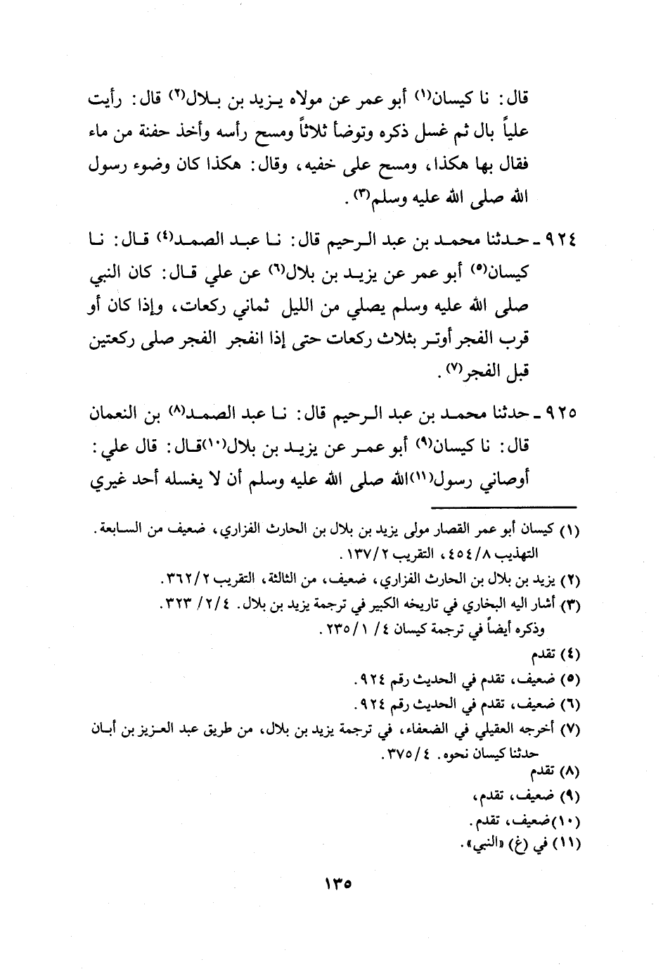 925 - حَدَّثَنَا مُحَمَّدُ بْنُ عَبْدِ الرَّحِيمِ، قَالَ: نا عَبْدُ الصَّمَدِ بْنُ النُّعْمَانِ، قَالَ: نا كَيْسَانُ أَبُو عُمَرَ، عَنْ يَزِيدَ بْنِ بِلَالٍ، قَالَ: قَالَ عَلِيُّ: أَوْصَانِي رَسُولُ اللَّهِ صَلَّى اللهُ عَلَيْهِ وَسَلَّمَ: أَنْ لَا يُغَسِّلَهُ أَحَدٌ غَيْرِي -[136]-. §فَإِنَّهُ لَا يَرَى عَوْرَتِي إِلَّا طُمِسَتْ عَيْنَاهُ، قَالَ عَلِيٌّ: فَكَانَ الْعَبَّاسُ، وَأُسَامَةُ يُنَاوِلَانِي الْمَاءَ مِنْ وَرَاءِ السِّتْرِ