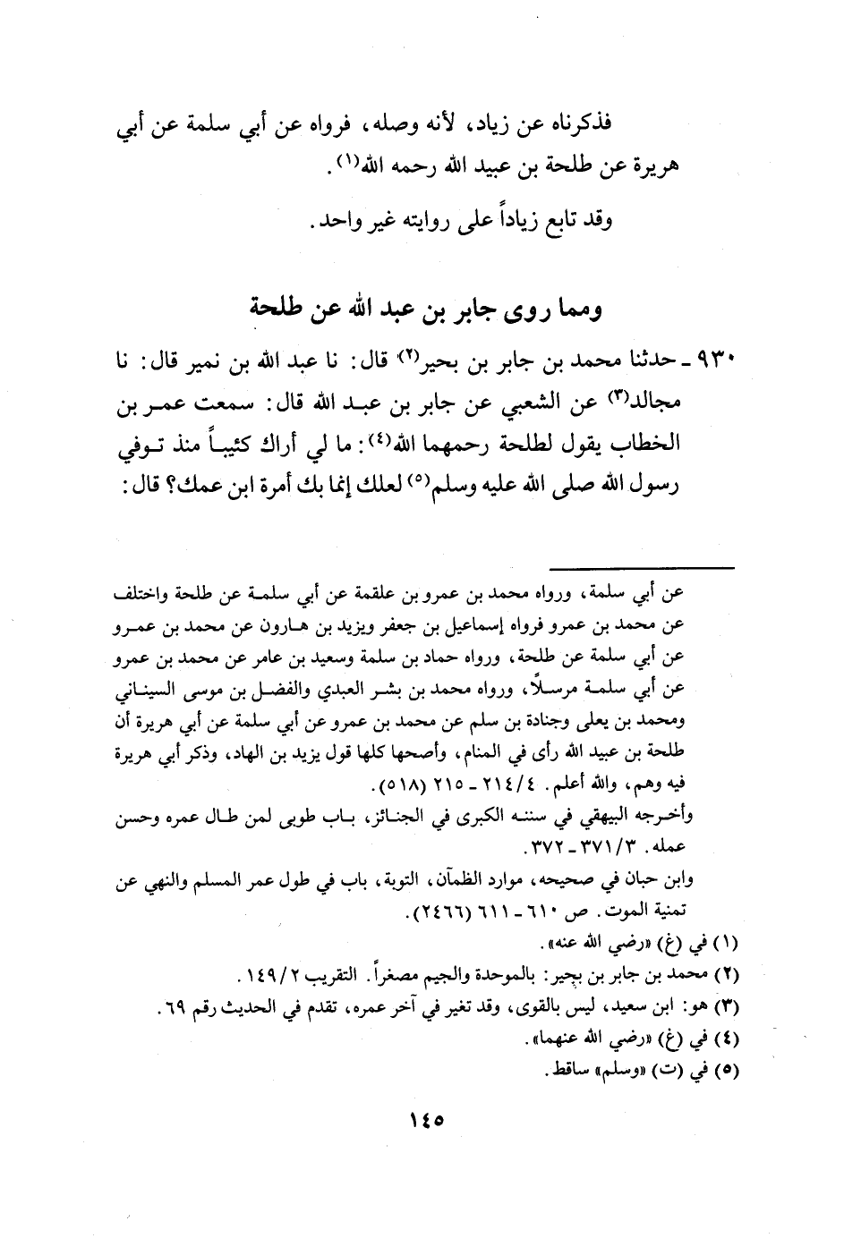 930 - حَدَّثَنَا مُحَمَّدُ بْنُ جَابِرِ بْنِ بُحَيْرٍ، قَالَ: نا عَبْدُ اللَّهِ بْنُ نُمَيْرٍ، قَالَ: نا مُجَالِدٌ، عَنِ الشَّعْبِيِّ، عَنْ جَابِرِ بْنِ عَبْدِ اللَّهِ، قَالَ: سَمِعْتُ عُمَرَ بْنَ الْخَطَّابِ، يَقُولُ لِطَلْحَةَ رَحِمَهُمَا اللَّهُ: مَالِي أَرَاكَ كَئِيبًا مُنْذُ تُوُفِّيَ رَسُولُ اللَّهِ صَلَّى اللهُ عَلَيْهِ وَسَلَّمَ: لَعَلَّكَ إِنَّمَا بِكَ إِمْرَةُ ابْنِ عَمِّكَ قَالَ -[146]-: لَا وَاللَّهِ وَإِنِّي لَأَجْدَرُكُمْ أَنْ لَا أَفْعَلَ قَالَ: فَمَالُكَ قَالَ: إِنِّي سَمِعْتُهُ صَلَّى اللهُ عَلَيْهِ وَسَلَّمَ يَقُولُ: " §إِنِّي لَأَعْلَمُ كَلِمَةً لَا يَقُولُهَا رَجُلٌ بِحَضْرَةِ الْمَوْتِ، إِلَّا وَجَدَ لَهَا رَوْحًا حِينَ يَخْرُجُ مِنْ جَسَدِهِ، فَقَالَ عُمَرُ: أَنَا أَعْلَمُهَا , قَالَ: وَمَا هِيَ؟ قَالَ: الْكَلِمَةُ الَّتِي قَالَهَا يَعْنِي لِعَمِّهِ لَا إِلَهَ إِلَّا اللَّهُ. قَالَ أَبُو بَكْرٍ: وَلَا نَعْلَمُ جَابِرَ بْنَ عَبْدِ اللَّهِ، رَوَى عَنْ طَلْحَةَ، إِلَّا هَذَا الْحَدِيثَ، وَلَا رَوَاهُ عَنْ مُجَالِدٍ إِلَّا عَبْدُ اللَّهِ بْنُ نُمَيْرٍ